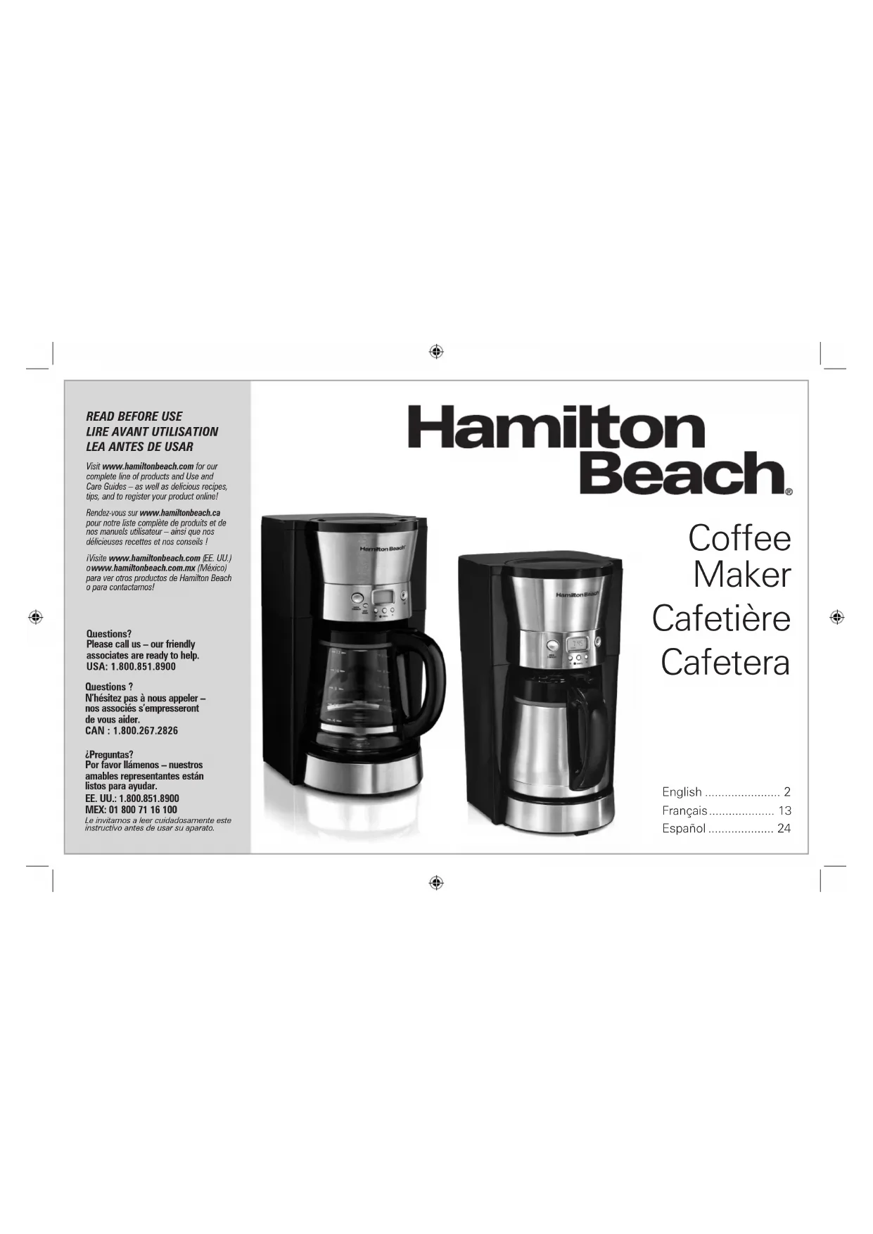 Visit www.hamiltonbeach.com for our complete line of products and Use and Care Guides – as well as delicious recipes, tips, and to register your product online! Rendez-vous sur www.hamiltonbeach.ca pour notre liste complète de produits et de nos manuels utilisateur – ainsi que nos délicieuses recettes et nos conseils ! ¡Visite www.hamiltonbeach.com ( EE. UU.)