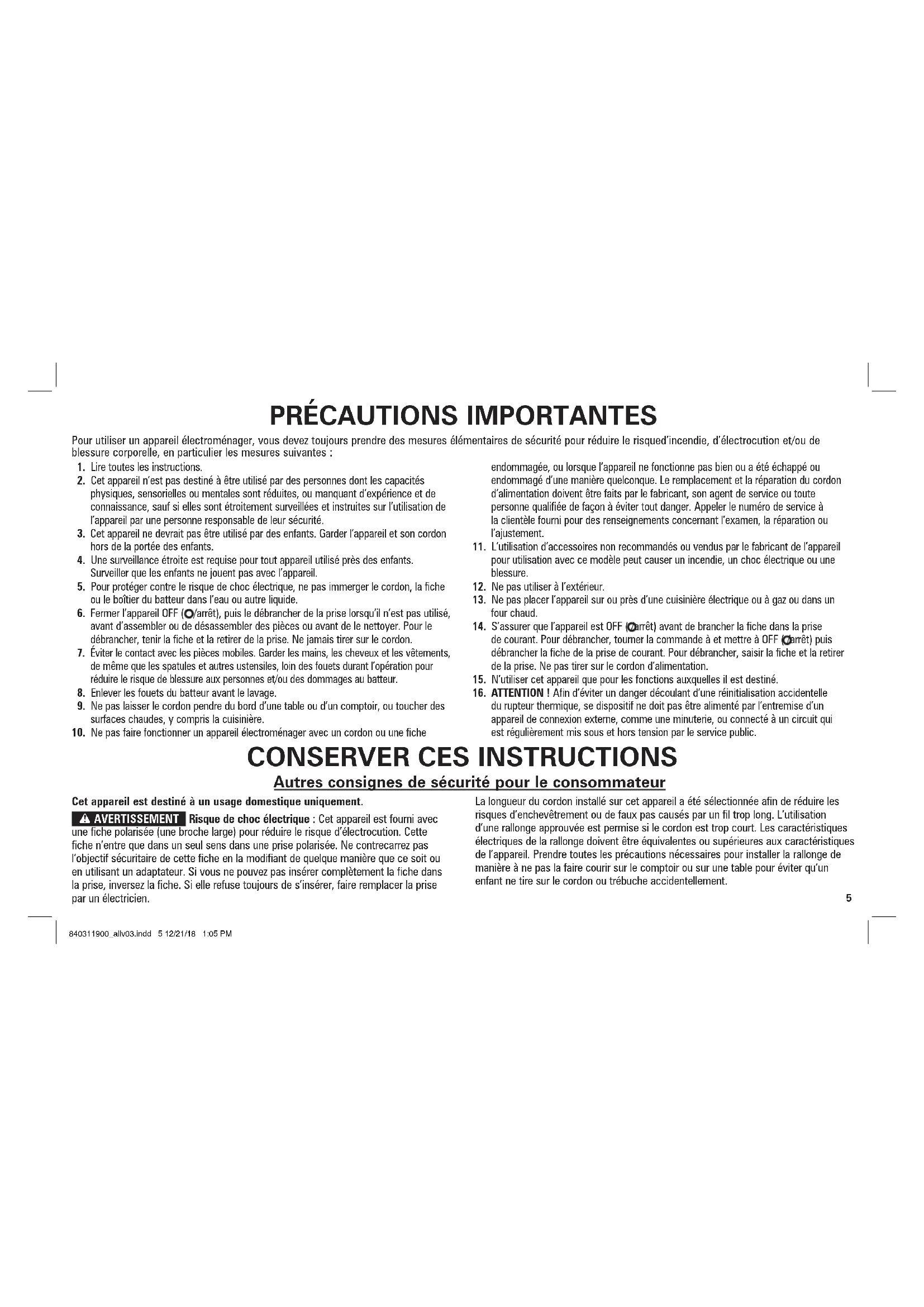 Autres consignes de sécurité pour le consommateur Cet appareil est destiné à un usage domestique uniquement. w AVERTISSEMENT Risque de choc électrique : Cet appareil est fourni avec une fiche polarisée (une broche large) pour réduire le risque d’électrocution. Cette fiche n’entre que dans un seul sens dans une prise polarisée. Ne contrecarrez pas l’objectif sécuritaire de cette fiche en la modifiant de quelque manière que ce soit ou en utilisant un adaptateur. Si vous ne pouvez pas insérer complètement la fiche dans la prise, inversez la fiche. Si elle refuse toujours de s’insérer, faire remplacer la prise par un électricien. La longueur du cordon installé sur cet appareil a été sélectionnée afin de réduire les risques d’enchevêtrement ou de faux pas causés par un fil trop long. L’utilisation d’une rallonge approuvée est permise si le cordon est trop court. Les caractéristiques électriques de la rallonge doivent être équivalentes ou supérieures aux caractéristiques de l’appareil. Prendre toutes les précautions nécessaires pour installer la rallonge de manière à ne pas la faire courir sur le comptoir ou sur une table pour éviter qu’un enfant ne tire sur le cordon ou trébuche accidentellement. 840311900_allv03.indd 5 12/21/18 1:05 PM6