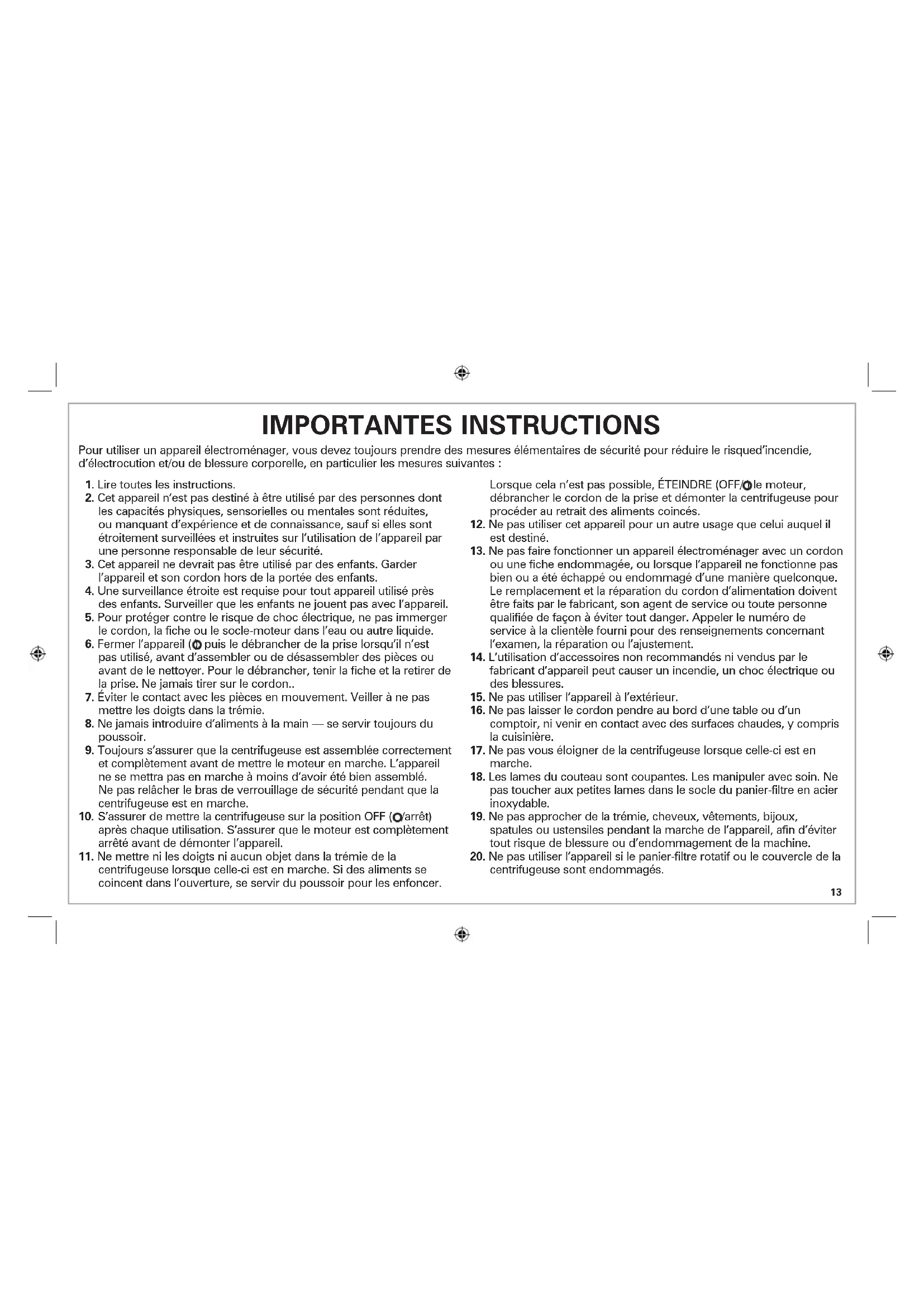 centrifugeuse sont endommagés. Pour utiliser un appareil électroménager, vous devez toujours prendre des mesures élémentaires de sécurité pour réduire le risqued’incendie, d’électrocution et/ou de blessure corporelle, en particulier les mesures suivantes :14