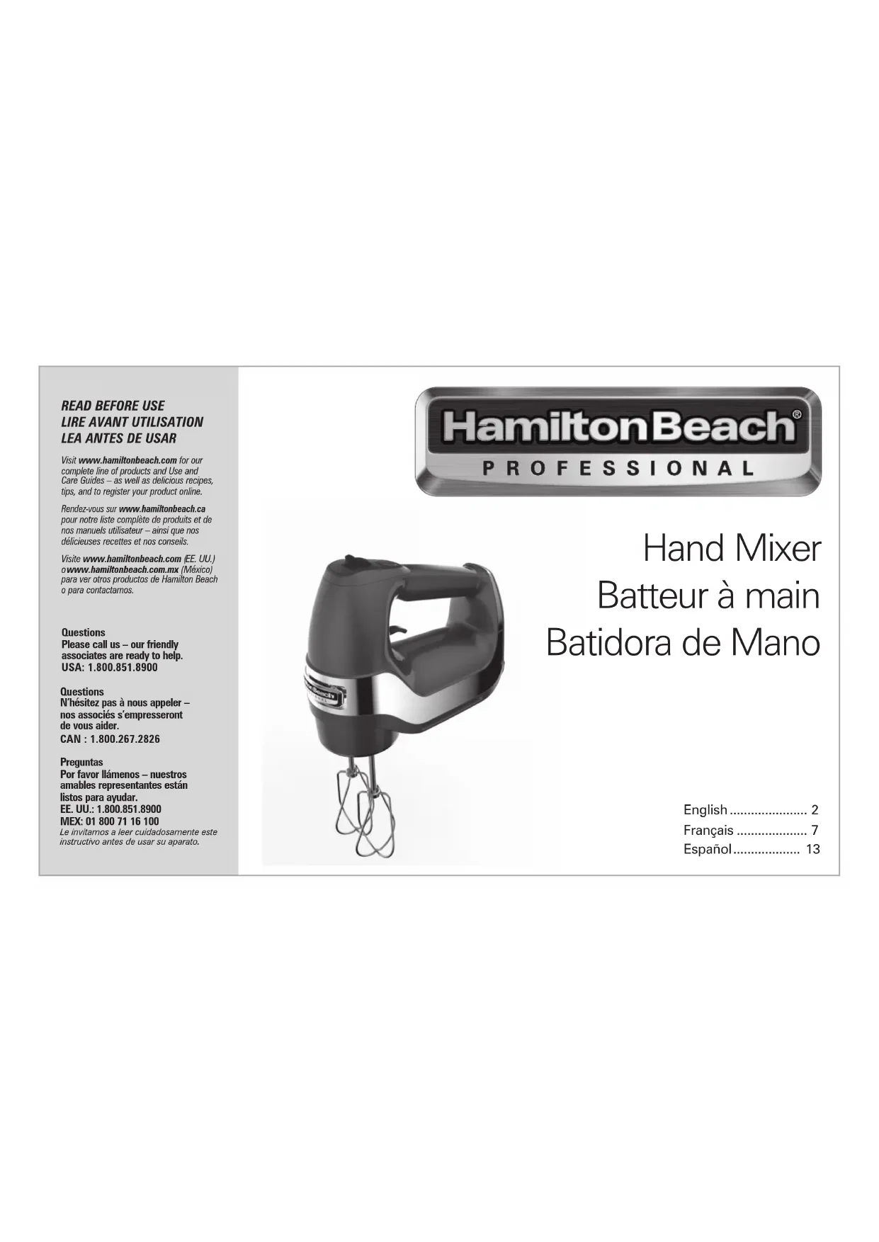 Visit www.hamiltonbeach.com for our complete line of products and Use and Care Guides – as well as delicious recipes, tips, and to register your product online. Rendez-vous sur www.hamiltonbeach.ca pour notre liste complète de produits et de nos manuels utilisateur – ainsi que nos délicieuses recettes et nos conseils. Visite www.hamiltonbeach.com ( EE. UU.)