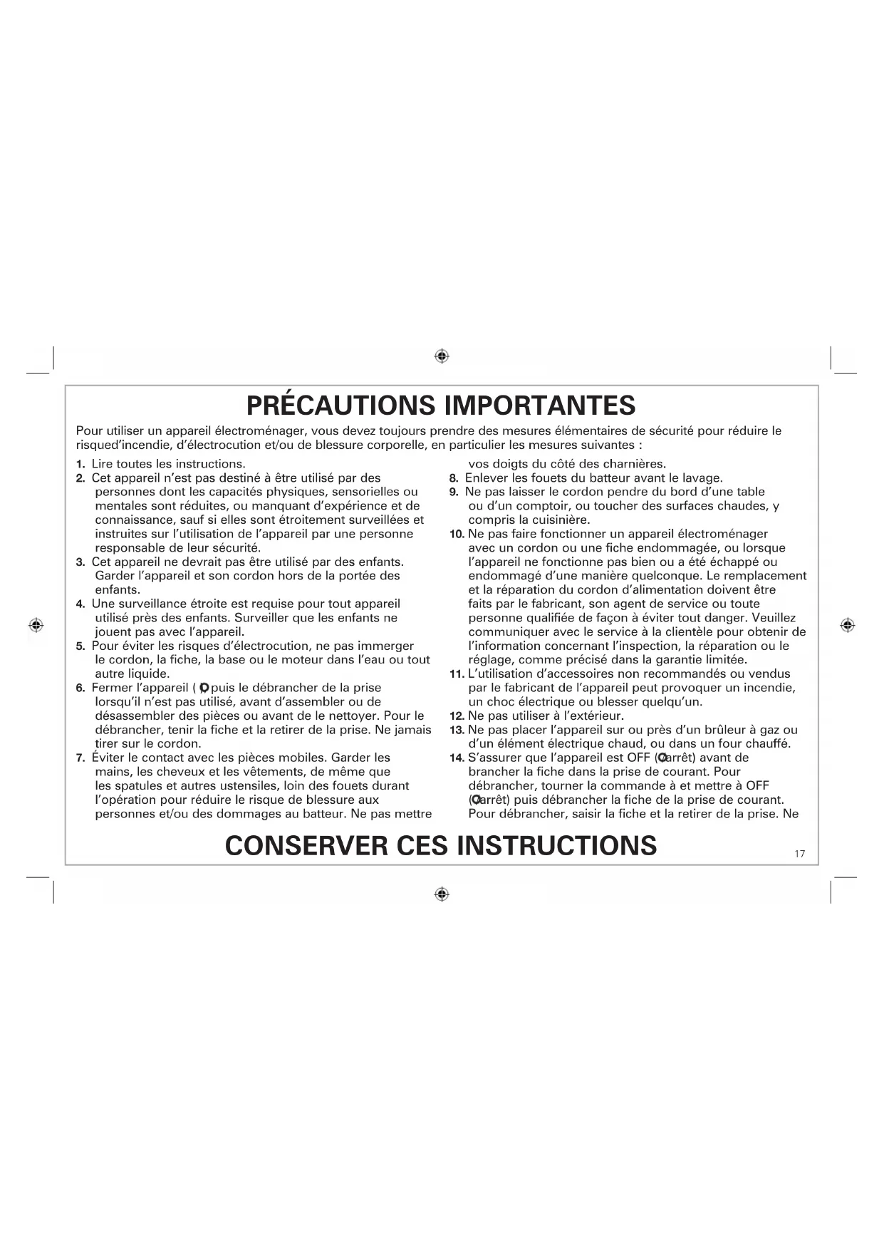 brancher la fiche dans la prise de courant. Pour débrancher, tourner la commande à et mettre à OFF ( /arrêt) puis débrancher la fiche de la prise de courant. Pour débrancher, saisir la fiche et la retirer de la prise. Ne Pour utiliser un appareil électroménager, vous devez toujours prendre des mesures élémentaires de sécurité pour réduire le risqued’incendie, d’électrocution et/ou de blessure corporelle, en particulier les mesures suivantes :