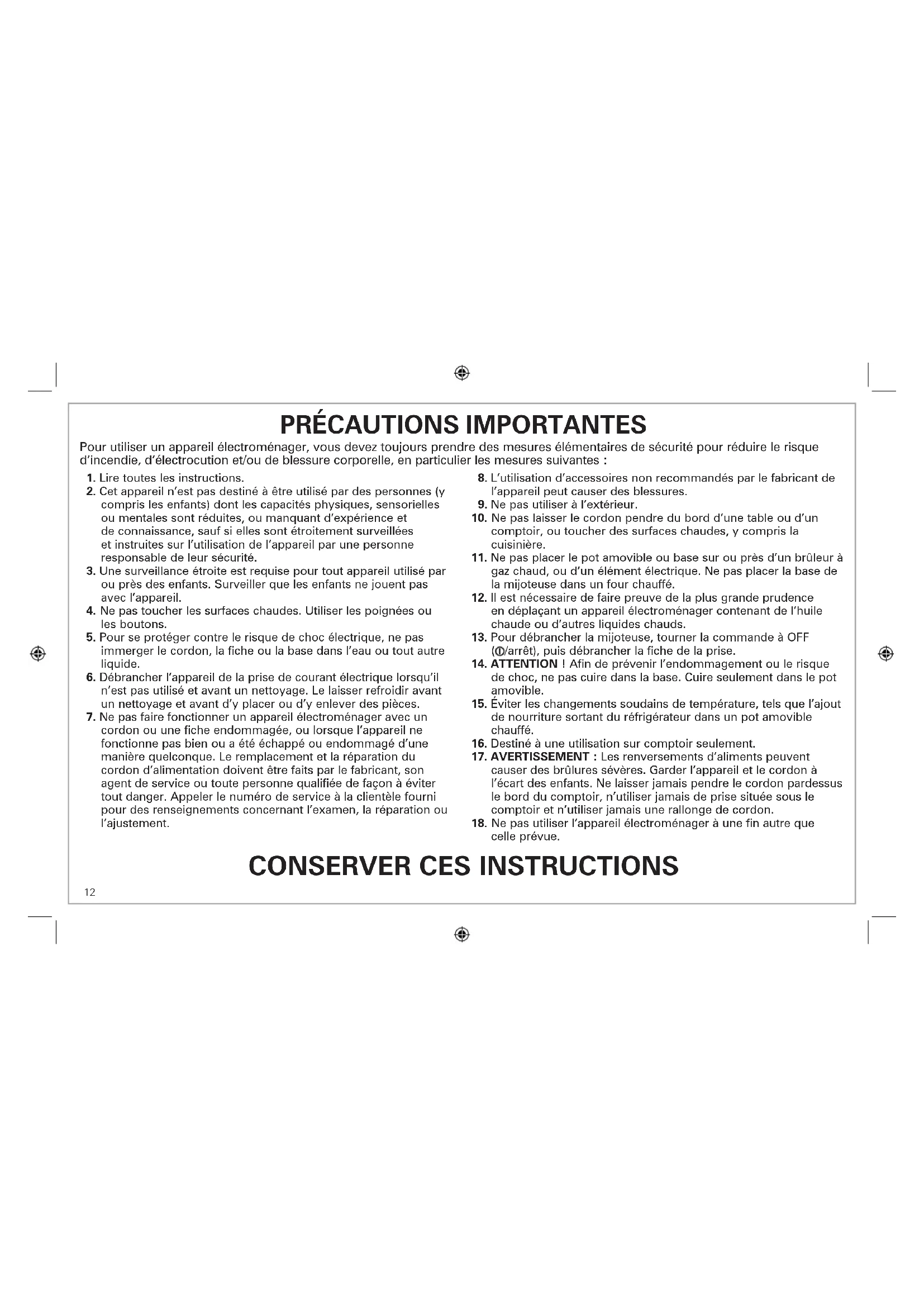Pour utiliser un appareil électroménager, vous devez toujours prendre des mesures élémentaires de sécurité pour réduire le risque d’incendie, d’électrocution et/ou de blessure corporelle, en particulier les mesures suivantes :
