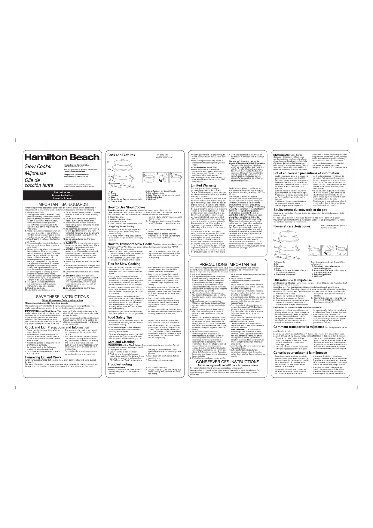 - Visiter foodsafety.gov ou fsis.usda.gov pour plus d’information à propos des températures internes de cuisson• Pour ranger les restes après la cuisson, ne PAS placer toute le pot amovible au réfrigérateur, car la durée de refroidissement sera trop longue. Séparer les restes en les déposants dans des petits contenants et placer au réfrigérateur.• Ne jamais laisser reposer une viande insuffisamment cuite ou crue dans une mijoteuse à la température ambiante. La viande doit être cuite dès qu’elle est placée dans le pot amovible (sauf pour les préparations faites la veille et que le pot amovible a été placée au réfrigérateur). Entretien et nettoyage w AVERTISSEMENT Risque de choc électrique. Débrancher l’appareil avant le nettoyage. N’immerger pas le cordon, la fiche ou la base dans l’eau.1. Débrancher et laisser refroidir.2. Utiliser des gants de cuisson pour retirer le pot.3. Laver le couvercle et le pot dans l’eau chaude savonneuse. Rincer et sécher. Le couvercle et le pot pouvent également être lavés dans au lave-vaisselle. NE PAS utiliser le réglage “SANI” du lave-vaisselle. Les températures du cycle “SANI” peuvent endommager le produit.4. Essuyer la base à l’aide d’un chiffon ou d’une éponge douce et humide et essuyer pour sécher.5. Ne pas verrouiller le couvercle lorsque vous rangez l’appareil. Dépannage La nourriture n’est pas suffisamment cuite.• La nourriture a-t-elle été cuite en utilisant le réglage KEEP WARM (maintien au chaud)? N’utiliser que les réglages LOW (basse) et HIGH (élevée) pour cuire des aliments.• L’alimentation électrique a-t-elle été coupée?• Le réglage LOW (basse) a-t-il été sélectionné alors qu’une durée de cuisson basée sur le réglage HIGH (élevée) a été utilisée?• Le pot a été trop rempli. Pour obtenir les meilleurs résultats, ne pas remplir le pot en faïence à plus de 1 po (2,5 cm) du couvercle.• Le couvercle n’a pas été bien placé. S’assurer que le couvercle est bien placé sur le pot.Mon repas était trop cuit. Pourquoi?• La température des aliments continue à augmenter une fois la température souhaitée atteinte. Vérifier les aliments une fois la durée de cuisson atteinte.• Le réglage HIGH (élevée) a-t-il été sélectionné alors qu’une durée de cuisson basée sur le réglage LOW (basse) a été utilisée?• Le pot était moins qu’à la moitié plein. Vérifier la cuisson 1 à 2 heures avant la fin du temps proposé par la recette.Les aliments ne sont pas cuits après le temps de cuisson recommandé de la recette.• Une variation de la tension de ligne (qui arrive plus souvent qu’on le pense) ou l’altitude peut causer cette situation. Les fluctuations légères de l’alimentation n’ont pas d’effets notables sur la majorité des appareils. Cependant, elles peuvent augmenter le temps de cuisson d’une mijoteuse. L’expérience seule permettra de savoir s’il faut plus ou moins de temps de cuisson. Garantie limitée Cette garantie s’applique aux produits achetés et utilisées aux É.-U. et au Canada. C’est la seule garantie expresse pour ce produit et est en lieu et place de tout autre garantie ou condition.Ce produit est garanti contre tout défaut de matériaux et de main-d’oeuvre pour une période des cinq (5) ans à compter de la date d’achat d’origine au Canada et un (1) an à compter de la date d’achat d’origine aux É.-U. Au cours de cette période, votre seul recours est la réparation ou le remplacement de ce produit ou tout composant s’avérant défectueux, à notre gré, mais vous êtes responsable de tous les coûts liés à l’expédition du produit et le retour d’un produit ou d’un composant dans le cadre de cette garantie. Si le produit ou un composant n’est plus offert, nous le remplacerons par un produit similaire devaleur égale ou supérieure.Cette garantie ne couvre pas le verre, les filtres, l’usure d’un usage normal, l’utilisation non conforme aux directives imprimées, ou des dommages au produit résultant d’un accident, modification, utilisation abusive ou incorrecte. Cette garantie s’applique seulement à l’acheteur original ou à la personne l’ayant reçu en cadeau. La présentation du reçu de vente d’origine comme preuve d’achat est nécessaire pour faire une réclamation au titre de cette garantie. Cette garantie s’annule si le produit est utilisé autrement que par une famille ou si l’appareil est soumis à toute tension ou forme d’onde différente des caractéristiques nominales précisées sur l’étiquette (par ex. : 120 V ~ 60 Hz).Nous excluons toutes les réclamations au titre de cette garantie pour les dommages spéciaux, consécutifs et indirects causés par la violation de garantie expresse ou implicite. Toute responsabilité est limitée au prix d’achat. Chaque garantie implicite, y compris toute garantie ou condition de qualité marchande ou d’adéquation à un usage particulier, est exonérée, sauf dans la mesure interdite par la loi, auquel cas la garantie ou condition est limitée à la durée de cette garantie écrite. Cette garantie vous donne des droits légaux précis. Vous pouvez avoir d’autres droits qui varient selon l’endroit où vous habitez. Certaines provinces ne permettent pas les limitations sur les garanties implicites ou les dommages spéciaux ou indirects de telle sorte que les limitations ci-dessus ne s’appliquent peut-être pas à votre cas.Ne pas retourner cet appareil au magasin lors d’une réclamation au titre de cette garantie. Veuillez nous écrire à Hamilton Beach Brands, Inc., Customer Service Department, 4421 Waterfront Dr., Glen Allen, VA 23060, ou visiter le site hamiltonbeach.com/customer-service aux États-Unis ou hamiltonbeach.ca/customer-service au Canada. Pour obtenir un service plus rapide, veuillez repérer les numéros de modèle, de type et de séries sur votre appareil