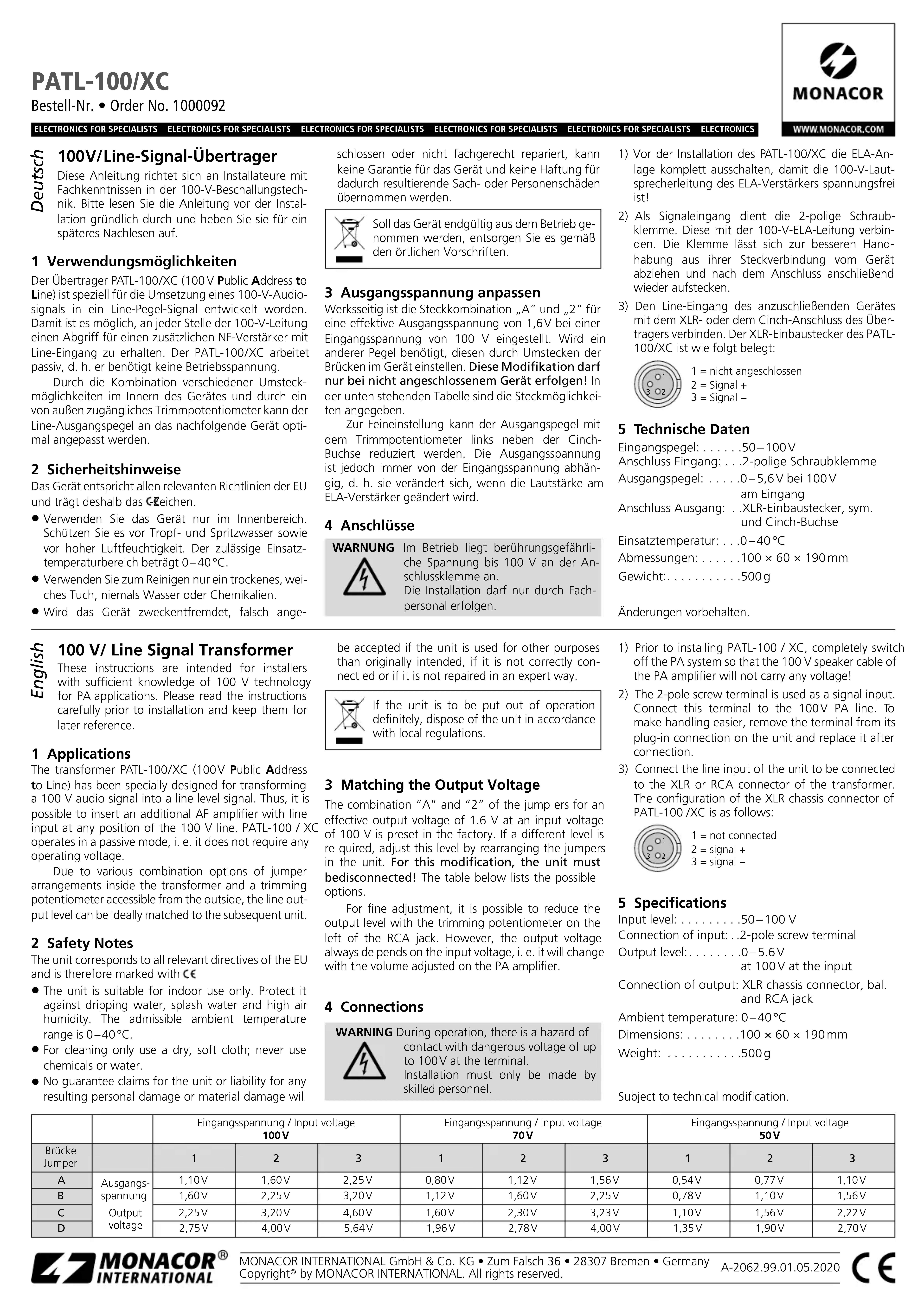 - × 60 × 190 mmPeso: gCon riserva di modifiche tecniche. PATL-100/XC Référence num. • Codice 1000092 Transformateur signal ligne 100 V Cette notice s’adresse aux installateurs possédant des connaissances suffisantes en technique de sonorisation ligne 100 V. Veuillez lire la présente notice avec attention avant l‘installation et conser-vez-la pour pouvoir vous y reporter ultérieurement. 1 Possibilités d’utilisation Le transformateur PATL-100 / XC (100 V Public Address to Line) est spécialement conçu pour transformer un signal audio 100 V en un signal niveau Ligne. Il est ainsi possible, à n’importe quel endroit de la ligne 100 V, d’obtenir un accès pour repiquer le signal pour un amplificateur basse fréquence supplémentaire avec entrée Ligne. Le PATL-100 / XC fonctionne en mode passif, c’est-à-dire qu’il ne nécessite aucune tension de fonctionnement.En combinant diverses possibilités de placement de cavaliers dans l’appareil et par un potentiomètre trimmer accessible de l’extérieur, le niveau de sortie Ligne peut être adapté de manière optimale à l’appareil suivant. 2 Conseils de sécurité L’appareil répond à toutes les directives nécessaires de l’Union européenne et porte donc le symbole . L’appareil n’est conçu que pour une utilisation en intérieur. Protégez-le de tout type de projections d’eau, des éclaboussures et d’une humidité d‘air élevée. La plage de température ambiante admis-sible est de 0 – 40 °C. Pour le nettoyage, utilisez uniquement un chiffon sec et doux, en aucun cas de produits chimiques ou d’eau. Nous déclinons toute responsabilité en cas de dom-mages matériels ou corporels résultants si l’appareil est utilisé dans un but autre que celui pour lequel il a été conçu, s’il n’est pas correctement branché ou s’il n’est pas reparé par une personne habilitée; en outre, la garantie deviendrait caduque.Lorsque l’appareil est définitivement retiré du service, vous devez l‘éliminer conformé-ment aux directives locales.CARTONS ET EMBALLAGE PAPIER À TRIER 3 Adaptation de la tension de sortie A l’usine, la combinaison «A» et «2» des cavaliers pour une tension de sortie effective de 1,6 V à une tension d’entrée de 100 V est préréglée. Si un autre niveau est nécessaire, réglez-le en modifiant les cava-liers dans l’appareil. Cette modification ne doit être effectuée que lorsque l’appareil est déconnecté du secteur! Le tableau ci-dessous présente les possi-bilités de positionnement.Pour un réglage précis, il est possible de diminuer le niveau de sortie avec le potentiomètre trimmer à gauche de la prise RCA. Cependant, la tension de sor-tie dépend toujours de la tension d’entrée, c’est-à-dire elle se modifie lorsque le volume est modifié sur l’am-plificateur Public Adress. 4 Branchements ATTENTION Pendant le fonctionnement, une ten-sion dangereuse de 100 V maximum est présente à la borne de branchement.Seul un personnel qualifié et habilité peut effectuer l’installation.1) Avant d’installer le PATL-100 / XC, éteignez complè-tement l’installation Public Adress pour que le câble haut-parleur 100 V de l’amplificateur Public Adress ne soit pas porteur de tension!2) La borne à vis 2 pôles sert d’entrée de signal. Reliez-la à la ligne PA 100 V. Pour une meilleure manipulation, il est possible de retirer la borne de son branchement encastré et après le branchement de la replacer.3) Reliez l’entrée Ligne de l’appareil à relier au connec-teur XLR ou RCA du transformateur. La configura-tion de la fiche XLR châssis du PATL-100 / XC est la suivante : p. 500