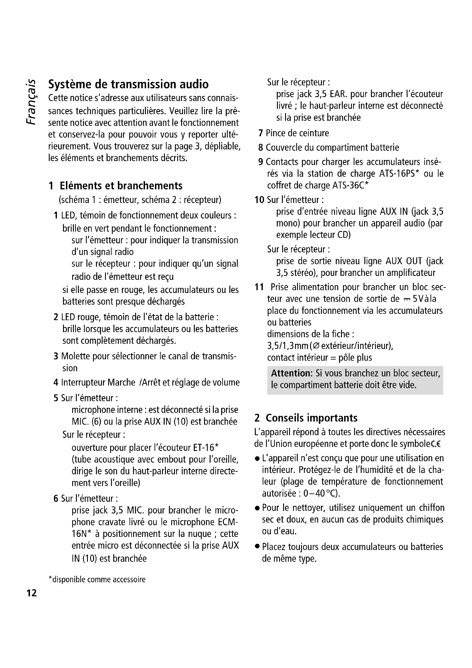 INTERNATIONAL GmbH & Co. KG. No part of this instruction manual may be reproduced in any form or by any means for any commercial use.12 Français Deutsch Deutsch Seite Inhalt English English Page Contents Italiano Italiano Pagina Indice Español Español Página Contenidos Nederlands Nederlands Pagina Inhoud Polski Polski Strona Spis treści Magyar Magyar Oldal Système de transmission audio Cette notice s‘adresse aux utilisateurs sans connais- sances techniques particulières. Veuillez lire la pré- sente notice avec attention avant le fonctionnement et conservez-la pour pouvoir vous y reporter ulté- rieurement. Vous trouverez sur la page 3, dépliable, les éléments et branchements décrits. 1 Eléments et branchements (schéma 1 : émetteur, schéma 2 : récepteur) 1 LED, témoin de fonctionnement deux couleurs : brille en vert pendant le fonctionnement : sur l’émetteur : pour indiquer la transmission d’un signal radio sur le récepteur : pour indiquer qu’un signal radio de l’émetteur est reçu si elle passe en rouge, les accumulateurs ou les batteries sont presque déchargés 2 LED rouge, témoin de l’état de la batterie : brille lorsque les accumulateurs ou les batteries sont complètement déchargés. 3 Molette pour sélectionner le canal de transmis- sion 4 Interrupteur Marche /Arrêt et réglage de volume 5 Sur l’émetteur : microphone interne : est déconnecté si la prise MIC. (6) ou la prise AUX IN (10) est branchée Sur le récepteur : ouverture pour placer l’écouteur ET-16* (tube acoustique avec embout pour l’oreille, dirige le son du haut-parleur interne directe- ment vers l’oreille) 6 Sur l’émetteur : prise jack 3,5 MIC. pour brancher le micro- phone cravate livré ou le microphone ECM- 16N* à positionnement sur la nuque ; cette entrée micro est déconnectée si la prise AUX IN (10) est branchée Sur le récepteur : prise jack 3,5 EAR. pour brancher l’écouteur livré ; le haut-parleur interne est déconnecté si la prise est branchée 7 Pince de ceinture 8 Couvercle du compartiment batterie 9 Contacts pour charger les accumulateurs insé- rés via la station de charge ATS-16PS* ou le coffret de charge ATS-36C* 10 Sur l’émetteur : prise d’entrée niveau ligne AUX IN (jack 3,5 mono) pour brancher un appareil audio (par exemple lecteur CD) Sur le récepteur : prise de sortie niveau ligne AUX OUT (jack 3,5 stéréo), pour brancher un amplificateur 11 Prise alimentation pour brancher un bloc sec- teur avec une tension de sortie de