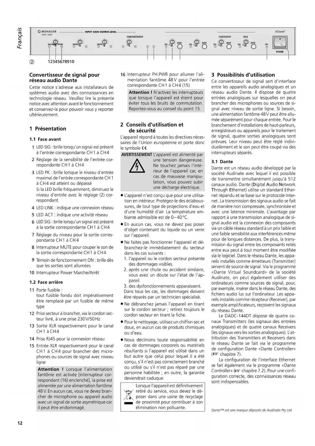 Convertisseur de signal pour réseau audio Dante Cette notice s’adresse aux installateurs de systèmes audio avec des connaissances en technologie réseau. Veuillez lire la présente notice avec attention avant le fonctionnement et conservez-la pour pouvoir vous y reporter ultérieurement. 1 Présentation