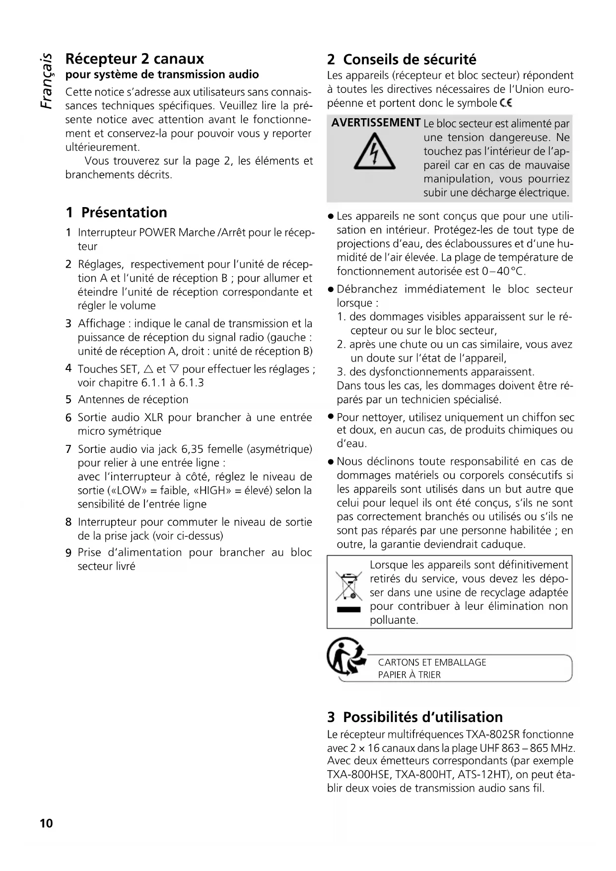 3 Possibilités d‘utilisation Le récepteur multifréquences TXA-802SR fonctionne avec 2 × 16 canaux dans la plage UHF 863 – 865 MHz. Avec deux émetteurs correspondants (par exemple TXA-800HSE, TXA-800HT, ATS-12HT), on peut éta- blir deux voies de transmission audio sans fil. Français Français Page11 Français