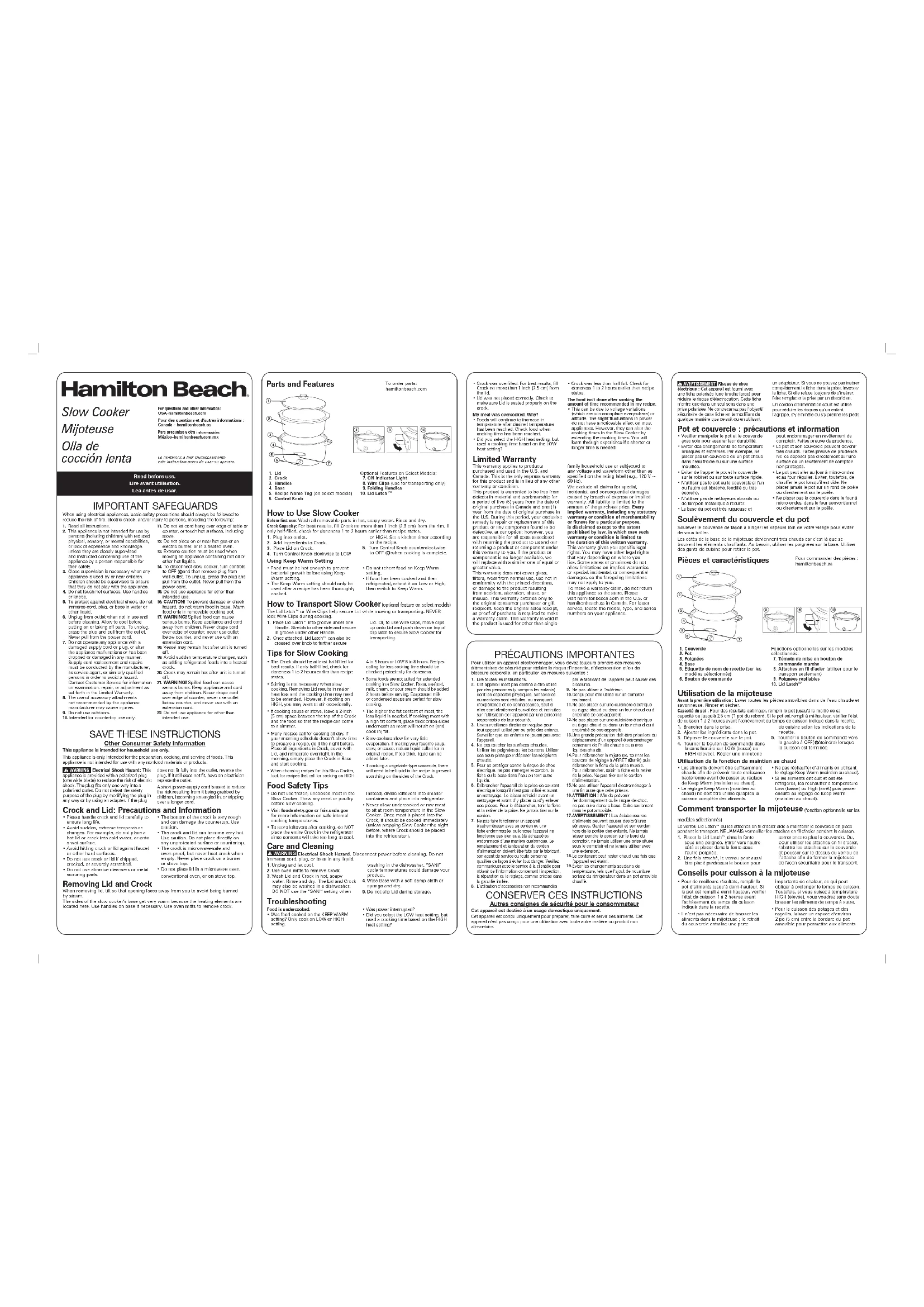 Recipe Name Tag (on select models) Control KnobOptional Features on Select Models: ON Indicator Light Wire Clips (use for transporting only) Folding Handles Lid Latch For questions and other information: USA–hamiltonbeach.comPour des questions et d’autres informations : Canada – hamiltonbeach.caPara preguntas y otra información: México–hamiltonbeach.com.mx Le invitamos a leer cuidadosamente este instructivo antes de usar su aparato.To order parts:hamiltonbeach.comw AVERTISSEMENT Risque de choc électrique : Cet appareil est fourni avec une fiche polarisée (une broche large) pour réduire le risque d’électrocution. Cette fiche n’entre que dans un seul sens dans une prise polarisée. Ne contrecarrez pas l’objectif sécuritaire de cette fiche en la modifiant de quelque manière que ce soit ou en utilisant un adaptateur. Si vous ne pouvez pas insérer complètement la fiche dans la prise, inversez la fiche. Si elle refuse toujours de s’insérer, faire remplacer la prise par un électricien.Un cordon d’alimentation court est utilisé pour réduire les risques qu’un enfant l’agrippe, s’y emmêle ou s’y prenne les pieds. Pot et couvercle : précautions et information