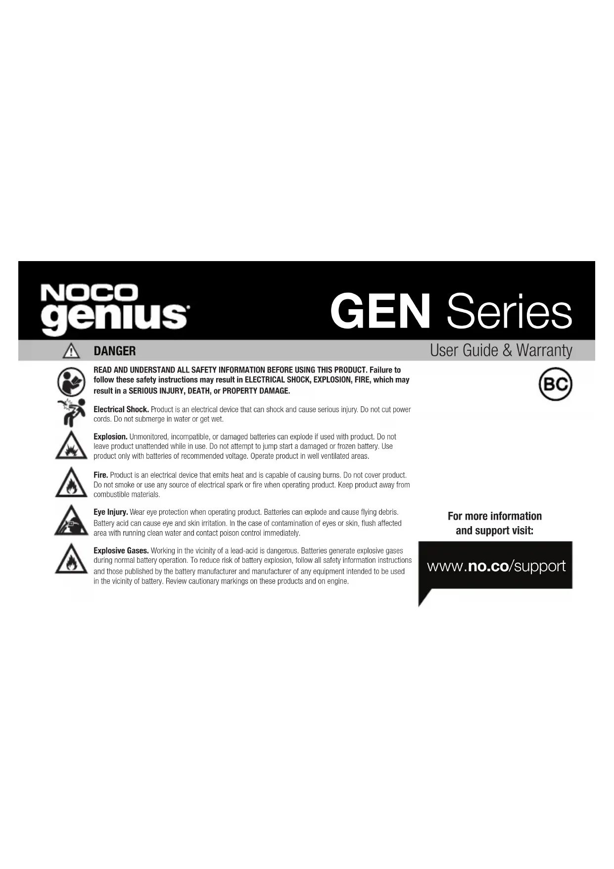 These conditions apply only to Product during the Warranty Period. The Hassle-Free Warranty is void either by elapsed time from date of purchase (elapsed time from serial number date, if no proof of purchase) or from the conditions listed earlier in this document. Return Product with the appropriate documentation. With Receipt: 0-3 Years: NO Charge. With proof of purchase, The warranty period begins on date of purchase. With NO Receipt: 0-3 Years: NO Charge. With NO proof of purchase, The warranty period begins on the serial number date. We recommend registering your NOCO product in order to upload proof of purchase and extend your eective warranty dates. You may register your NOCO product online at: no.co/register. If you have any questions regarding your warranty or product, contact NOCO Support (email and phone number above) or write to: The NOCO Company, at 30339 Diamond Parkway, #102, Glenwillow, OH 44139 USA.Guide d’utilisation et garantie DANGER LISEZ ATTENTIVEMENT TOUTES LES CONSIGNES DE SÉCURITÉ AVANT D’UTILISER CE PRODUIT. La non-application des consignes de sécurité peut résulter en UN CHOC ÉLECTRIQUE, UNE EXPLOSION, DU FEU, ce qui peut conduire à de GRAVES BLESSURES, LA MORT ou des DÉGÂTS MATÉRIELS. Choc électrique. Le produit est un appareil électrique qui peut causer des chocs et des blessures graves. Ne coupez pas les cordons d’alimentation. Ne pas immerger ni mouiller. Explosion. Des batteries non-surveillées, incompatibles ou endommagées peuvent exploser si elles sont utilisées avec ce produit. N’utilisez pas ce produit sans le surveiller. Ne tentez pas de démarrer une batterie endommagée ou gelée. N’utilisez ce produit qu’avec les batteries recommandées. Utilisez ce produit dans des lieux bien aérés. Feu. Le produit est un appareil électrique émettant de la chaleur et capable de causer des brûlures. Ne couvrez pas le produit. Ne fumez pas et n’utilisez aucune source d’étincelles ou de feu quand vous utilisez ce produit. Tenez le produit à l’écart de matériaux combustibles. Blessures aux yeux. Utilisez des lunettes de protection lors de l’utilisation du produit. Les batteries peuvent exploser et projeter des débris. L’acide des batteries peut causer des irritations de la peau et des yeux. Dans la cas de contact avec les yeux ou la peau, rincez abondamment le point de contact avec de l’eau courante propre et contactez immédiatement le centre anti-poison. Gaz explosifs.Travailler à proximité de l’acide de plomb est dangereux. Les batteries produisent un gaz explosif durant leur utilisation normale. Pour réduire le risque d’explosion de batteries, conformez-vous à toutes les consignes de sécurité indiquées ici et celles indiquées par le fabricant de la batterie, ainsi que de celles de tout équipement utilisé dans les environs de la batterie. Prenez connaissance des indications de sécurité sur ces produits et sur le moteur.Pour plus d’informations, rendez-vous sur le site: www.no.co/support Français GEN SeriesÀ propos de GEN Series. Le NOCO GEN Series chargeur de batterie embarqué représente l’une des technologies les plus innovatrices et avancées sur le marché, rendant chaque recharge simple et facile. Il s’agit peut-être du chargeur le plus sécuritaire et efficace que vous utiliserez jamais. La série GEN chargeur de batterie embarqué est conçue pour charger tous les types de batteries au plomb de 12V, y compris les batteries par voie humide (inondées), au gel, MF (sans entretien), CA (calcium), EFB (batteries liquides améliorées) et AGM (Absorbent Glass Mat), en plus des batteries au lithium de 12V (LiFePO4). Adaptée à la charge de batteries d’une capacité maximale de 120ampères-heures et à l’entretien des batteries de toutes dimensions. Premiers pas. Avant d’utiliser le chargeur, veuillez lire attentivement les indications du fabricant et les taux de chargement recommandés pour la batterie. Soyez certains de déterminez le voltage et la composition chimique de la batterie en consultant le guide d’utilisation avant tout chargement. Installation. Il est important de toujours penser à la distance de la batterie. La longueur du câble CC allant du chargeur à la pince ou à l’œillet des bornes de la batterie est d’environ 72 pouces (1828,8mm). Prévoir un jeu de 304mm (12po) entre les connexions. Proposition 65. AVERTISSEMENT: Ce produit peut vous exposer à des agents chimiques, y compris plomb et gaz d’échappement, identifiés par l’État de Californie comme pouvant causer le cancer et des malformations congénitales ou autres effets nocifs sur la reproduction. Pour de plus amples informations, prière de consulter www.P65Warnings. ca.gov. Précaution personnelle. N’utilisez le produit que pour les applications recommandées. Veillez à ce qu’il y ait toujours une personne à portée de voix pour pouvant vous venir en aide en cas d’urgence. Gardez suffisamment d’eau propre avec du savon près de vous en cas de contact avec l’acide de la batterie. Portez une protection des yeux et des vêtements de protection quand vous travaillez près d’une batterie. Lavez-vous toujours les mains après avoir manipulé des batteries et des matériaux correspondants. Ne manipulez pas ou ne portez pas d’objets en métal quand vous utilisez des batteries y compris des outils, des montres ou de bijoux. Si du métal tombe sur une batterie, cela peut causer une étincelle ou un court circuit résultant en un choc électrique, du feu, une explosion pouvant résulter en des blessures, la mort ou des dommages matériels. Mineurs. Si le produit doit être utilisé par un mineur, l’adulte achetant le produit s’engage à expliquer au mineur les instructions de sécurité détaillées et toutes les mises en garde nécessaires avant la première utilisation. Ne pas suivre cette recommandation relève entièrement de la responsabilité de l’acheteur qui accepte d’indemn