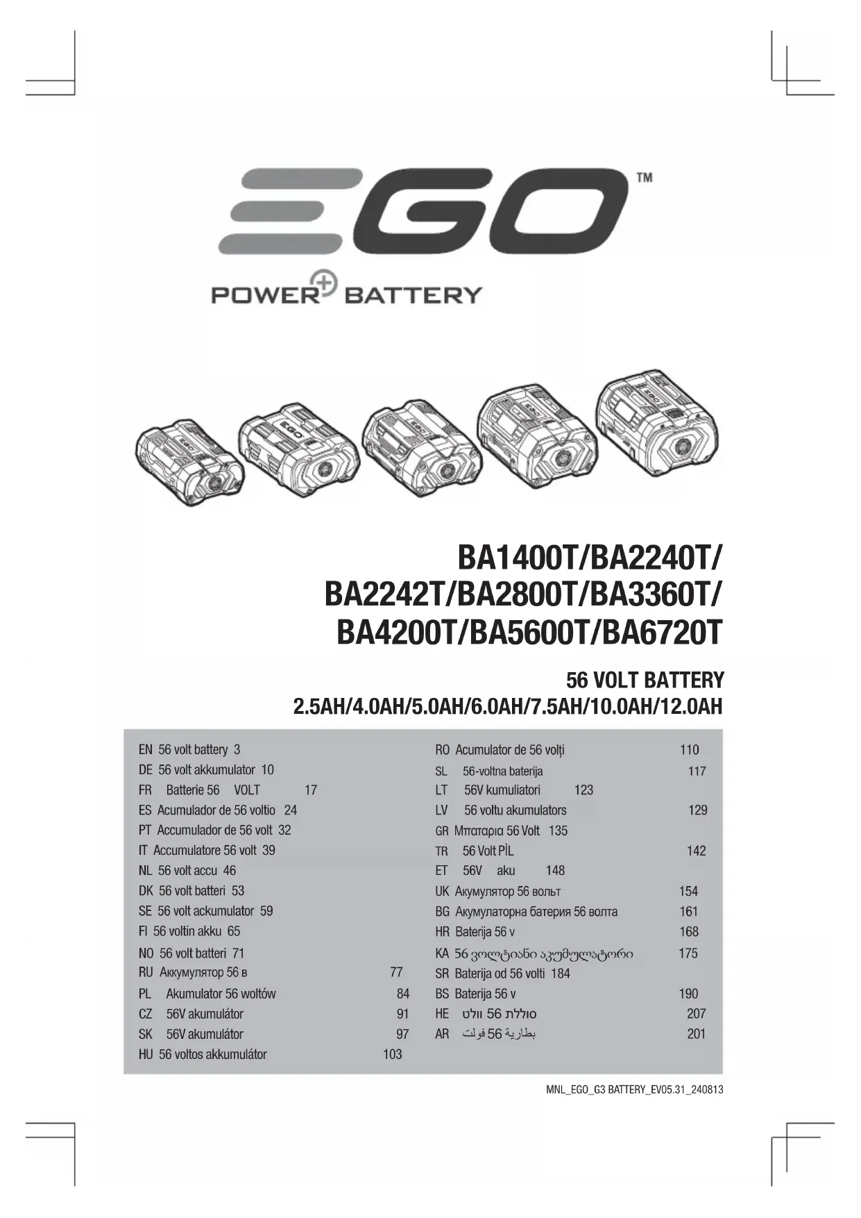 Respectez les instructions du manuel d’utilisation du produit EGO spécifique. ENTRETIEN AVERTISSEMENT : Afin de vous prémunir contreBATTERIE56 VOLT — BA1400T/BA2240T/BA2242T/BA2800T/BA3360T/BA4200T/BA5600T/BA6720T22 des blessures corporelles graves, retirez toujours la batterie de l’outil avant de changer un accessoire et avant toute opération de nettoyage ou d’entretien.