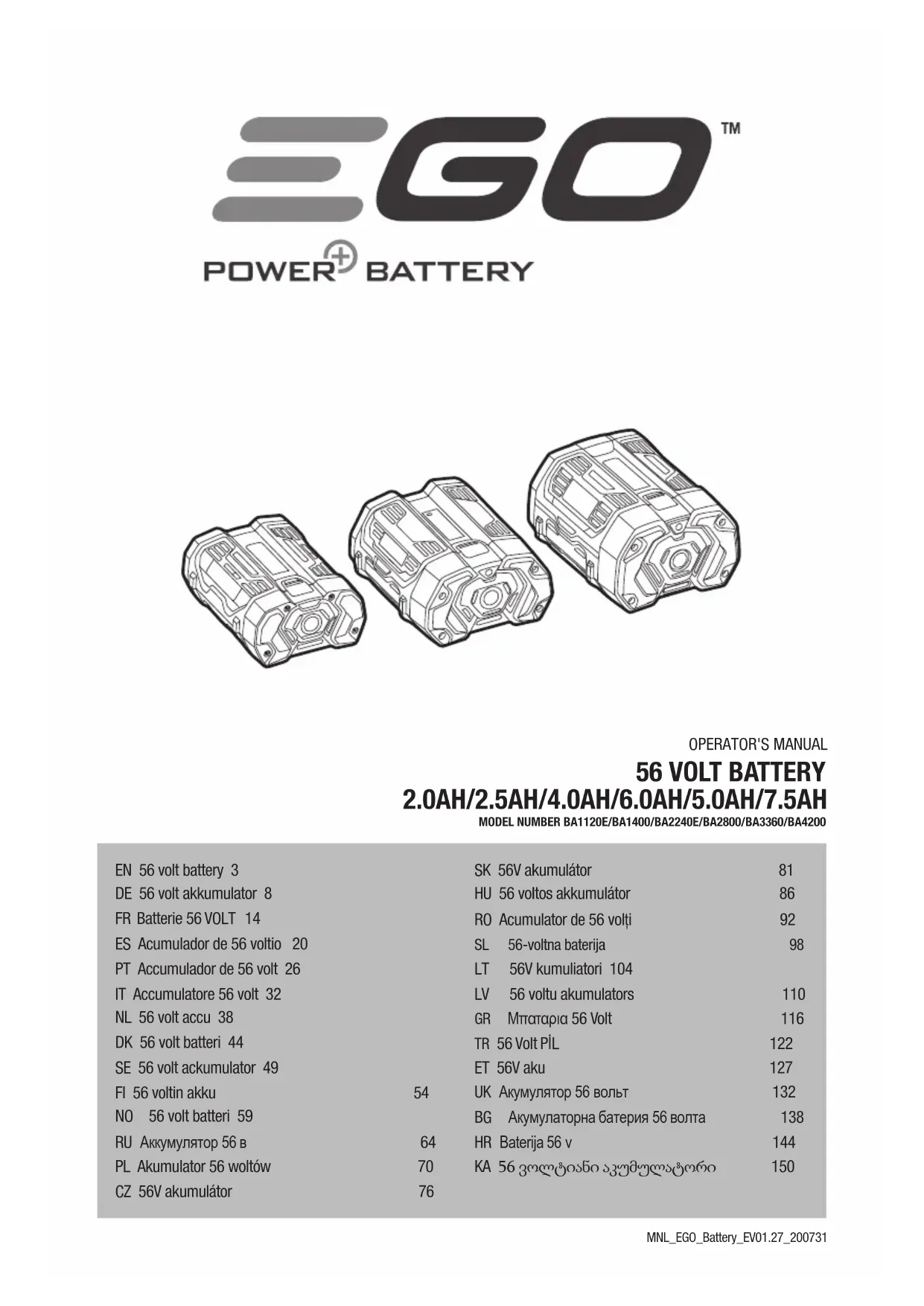 Veuillez consulter le site egopowerplus.com pour trouver l’ensemble des modalités et conditions de la politique de garantie EGO.ACUMULADOR DE 56 VOLTIO — BA1120E/BA1400/BA2240E/BA2800/BA3360/BA420020