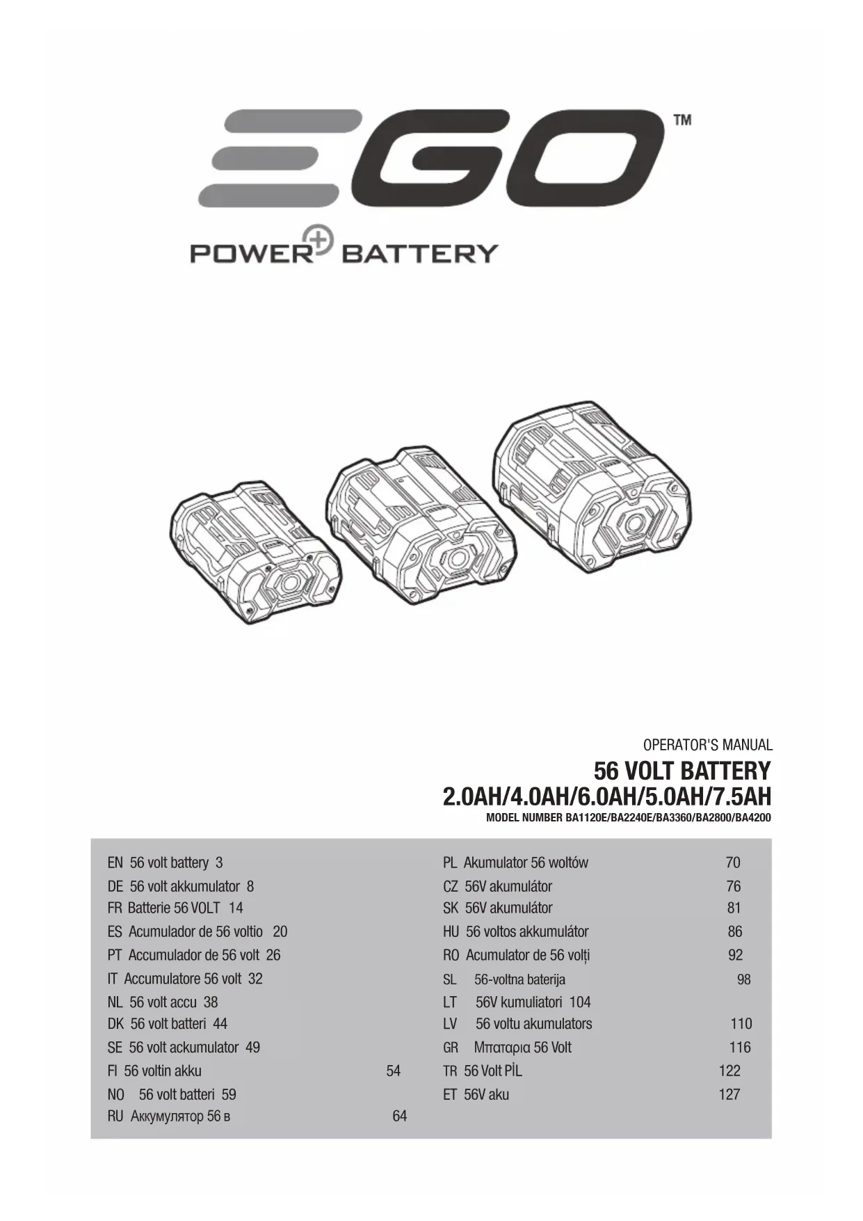 REMARQUE : Les batteries lithium-ion sont fournies partiellement chargées. Avant de les utiliser pour la première fois, rechargez-les complètement. REMARQUE : Cette batterie est équipée d’une fonction de maintenance automatique visant à prolonger sa durée de vie. En fonction de sa charge, la batterie effectue une auto-décharge automatiquement après un mois de stockage. Après cette maintenance automatique, la batterie se met en veille et conserve 30 % de sa charge maximale. Après l’avoir stockée pendant un mois ou plus, rechargez la batterie avant de la réutiliser.Il n’est pas nécessaire de la décharger complètement avant de la recharger. La batterie lithium-ion peut être rechargée n’importe quand et ne subit pas d’effet « mémoire » si elle est rechargée après une décharge incomplète. Utilisez le voyant d’alimentation pour déterminer quand la batterie a besoin d’être rechargée.BATTERIE56 VOLT — BA1120E/BA2240E/BA3360/BA2800/BA420018 RECHARGER LA BATTERIERespectez les instructions du manuel d’utilisation du chargeur rapide EGO CH5500E ou du chargeur CH2100E.ASSEMBLER OU DÉMONTER LA BATTERIERespectez les instructions du manuel d’utilisation du produit EGO spécique. ENTRETIEN