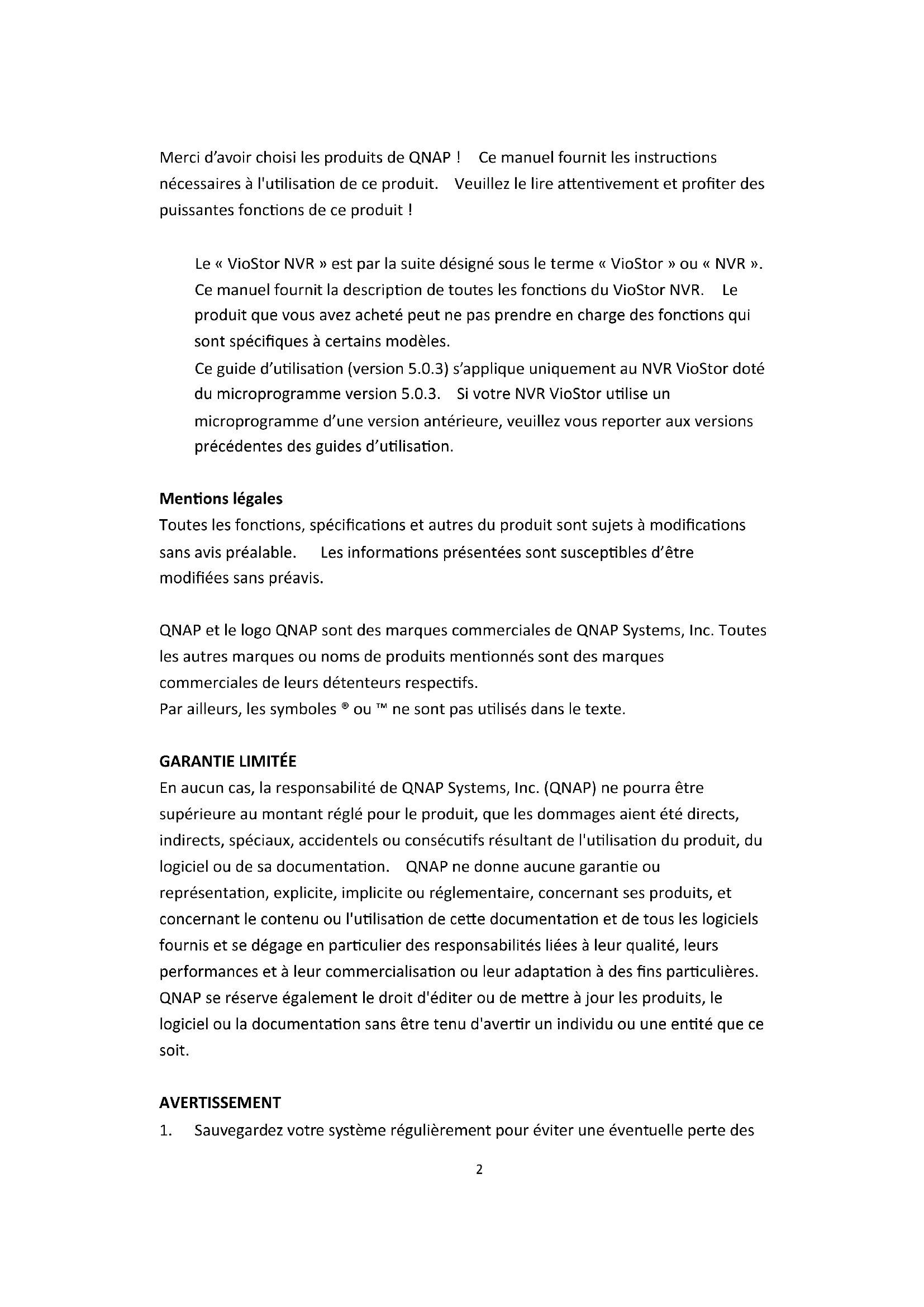 © 2015. QNAP Systems, Inc. Tous droits réservés.2 Merci d’avoir choisi les produits de QNAP ! Ce manuel fournit les instructions nécessaires à l'utilisation de ce produit. Veuillez le lire attentivement et profiter des puissantes fonctions de ce produit ! Le « VioStor NVR » est par la suite désigné sous le terme « VioStor » ou « NVR ». Ce manuel fournit la description de toutes les fonctions du VioStor NVR. Le produit que vous avez acheté peut ne pas prendre en charge des fonctions qui sont spécifiques à certains modèles. Ce guide d’utilisation (version 5.0.3) s’applique uniquement au NVR VioStor doté du microprogramme version 5.0.3. Si votre NVR VioStor utilise un microprogramme d’une version antérieure, veuillez vous reporter aux versions précédentes des guides d’utilisation. Mentions légales Toutes les fonctions, spécifications et autres du produit sont sujets à modifications sans avis préalable. Les informations présentées sont susceptibles d’être modifiées sans préavis. QNAP et le logo QNAP sont des marques commerciales de QNAP Systems, Inc. Toutes les autres marques ou noms de produits mentionnés sont des marques commerciales de leurs détenteurs respectifs. Par ailleurs, les symboles ® ou ™ ne sont pas utilisés dans le texte.