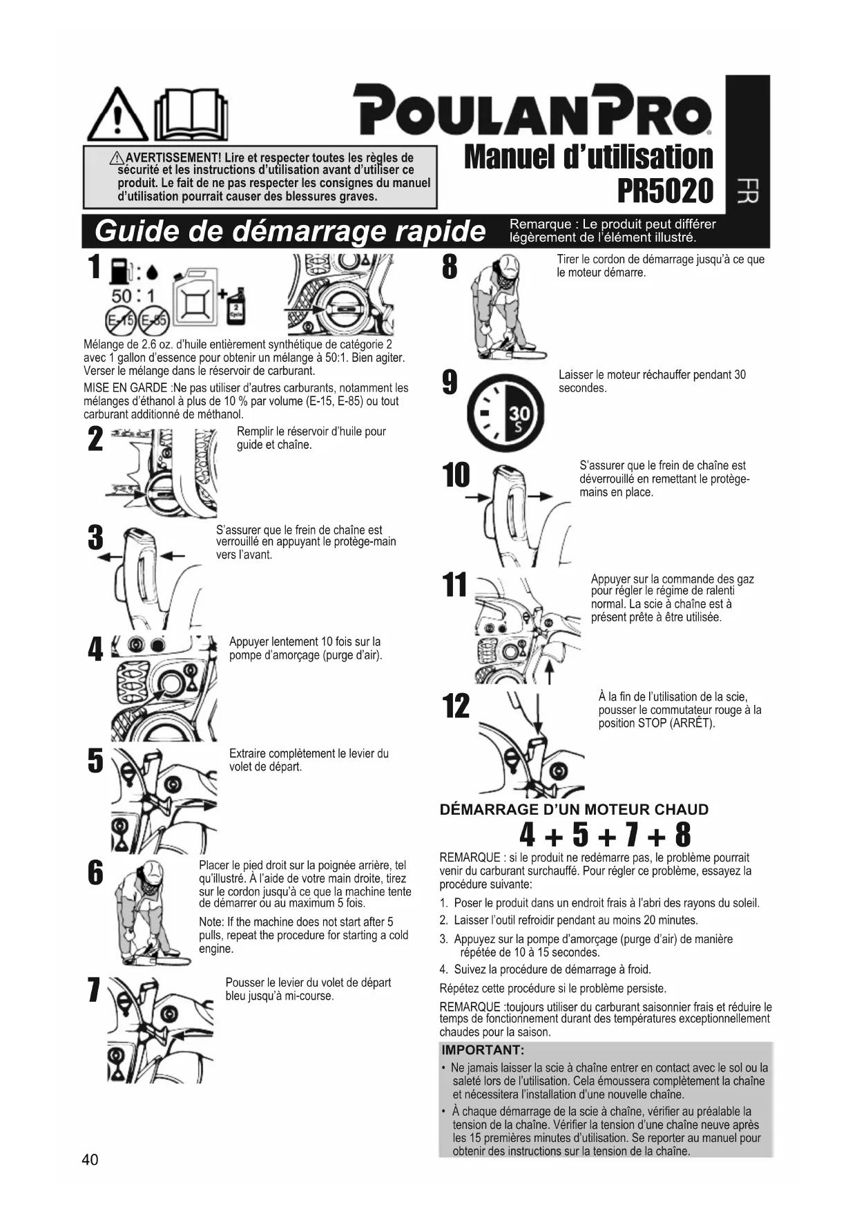 4 + 5 + 7 + 8 REMARQUE : si le produit ne redémarre pas, le problème pourrait venir du carburant surchauffé. Pour régler ce problème, essayez la procédure suivante:1. Poser le produit dans un endroit frais à l’abri des rayons du soleil.2. Laisser l’outil refroidir pendant au moins 20 minutes.3. Appuyez sur la pompe d’amorçage (purge d’air) de manière répétée de 10 à 15 secondes.4. Suivez la procédure de démarrage à froid.Répétez cette procédure si le problème persiste.REMARQUE :toujours utiliser du carburant saisonnier frais et réduire le temps de fonctionnement durant des températures exceptionnellement chaudes pour la saison.IMPORTANT:• Ne jamais laisser la scie à chaîne entrer en contact avec le sol ou la saleté lors de l’utilisation. Cela émoussera complètement la chaîne et nécessitera l’installation d’une nouvelle chaîne.