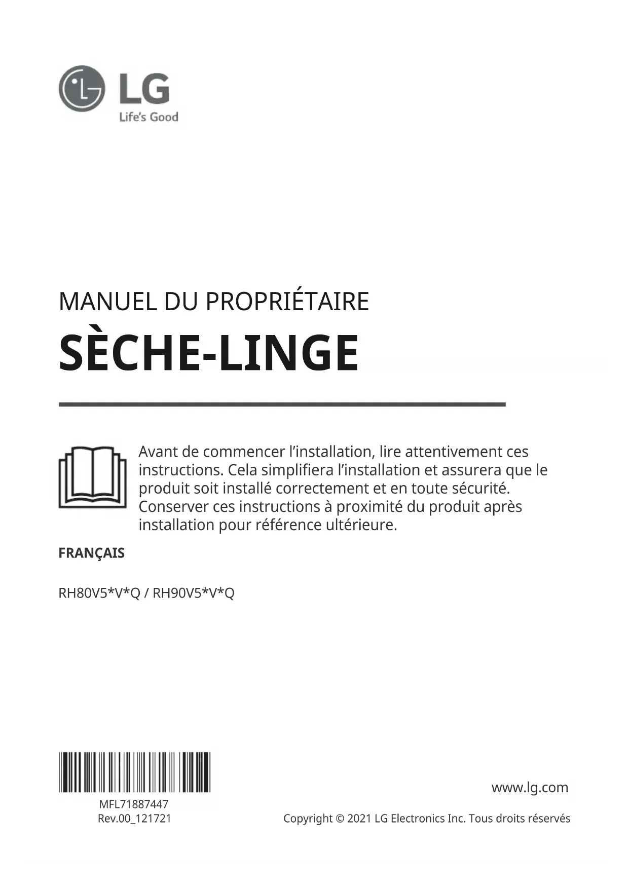SÈCHE-LINGE Avant de commencer l’installation, lire attentivement ces instructions. Cela simplifiera l’installation et assurera que le produit soit installé correctement et en toute sécurité. Conserver ces instructions à proximité du produit après installation pour référence ultérieure. FRANÇAIS RH80V5*V*Q / RH90V5*V*Q MFL71887447 Rev.00_121721 www.lg.com Copyright © 2021 LG Electronics Inc. Tous droits réservésTABLE DES MATIÈRES Ce manuel peut contenir des images ou un contenu différent du modèle que vous avez acheté. Ce manuel est sujet à révision par le fabricant.