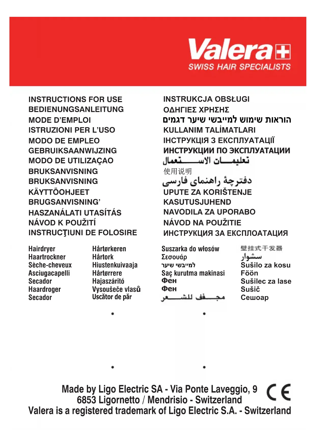 Débranchez toujours votre appareil avant de le nettoyer! Vous pouvez nettoyer l’appareil à l’aide d’un chiffon imbibé d’eau. Mais ne l’immergez ni dans l’eau ni dans tout autre liquide! Protégez votre appareil de la poussière. Si nécessaire, nettoyez la grille d’aération de celui-ci à l’aide d’une brosse ou d’un pinceau. ATTENTION: Il est formellement interdit de nettoyer les sèche- cheveux avec des liquides, des détergents, des solvants, de l'alcool et des produits chimiques. Sous réserve de modifications 00060713_19-03_Layout 1 29/01/2019 11:19 Pagina 1213 ISTRUZIONI PER L’USO - Istruzioni originali Leggere attentamente queste istruzioni per l’uso. Disponibili anche su www.valera.com