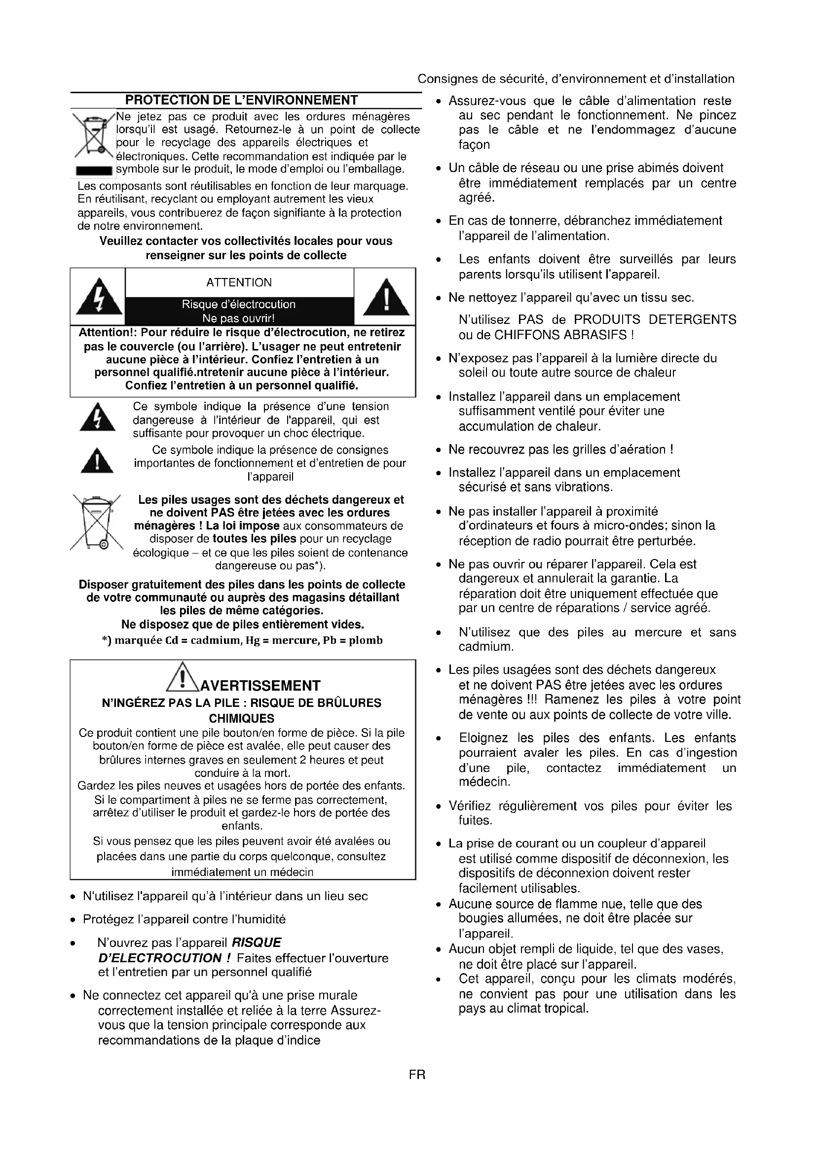N'utilisez l'appareil qu’à l’intérieur dans un lieu sec Protégez l’appareil contre l’humidité N’ouvrez pas l’appareil RISQUE D’ELECTROCUTION ! Faites effectuer l’ouverture et l’entretien par un personnel qualifié Ne connectez cet appareil qu'à une prise murale correctement installée et reliée à la terre Assurez- vous que la tension principale corresponde aux recommandations de la plaque d’indice Assurez-vous que le câble d’alimentation reste au sec pendant le fonctionnement. Ne pincez pas le câble et ne l’endommagez d’aucune façon Un câble de réseau ou une prise abimés doivent être immédiatement remplacés par un centre agréé. En cas de tonnerre, débranchez immédiatement l’appareil de l’alimentation. Les enfants doivent être surveillés par leurs parents lorsqu’ils utilisent l’appareil. Ne nettoyez l’appareil qu’avec un tissu sec. N’utilisez PAS de PRODUITS DETERGENTS ou de CHIFFONS ABRASIFS ! N’exposez pas l’appareil à la lumière directe du soleil ou toute autre source de chaleur Installez l’appareil dans un emplacement suffisamment ventilé pour éviter une accumulation de chaleur. Ne recouvrez pas les grilles d’aération ! Installez l’appareil dans un emplacement sécurisé et sans vibrations. Ne pas installer l’appareil à proximité d’ordinateurs et fours à micro-ondes; sinon la réception de radio pourrait être perturbée. Ne pas ouvrir ou réparer l’appareil. Cela est dangereux et annulerait la garantie. La réparation doit être uniquement effectuée que par un centre de réparations / service agréé. N’utilisez que des piles au mercure et sans cadmium. Les piles usagées sont des déchets dangereux et ne doivent PAS être jetées avec les ordures ménagères !!! Ramenez les piles à votre point de vente ou aux points de collecte de votre ville. Eloignez les piles des enfants. Les enfants pourraient avaler les piles. En cas d’ingestion d’une pile, contactez immédiatement un médecin. Vérifiez régulièrement vos piles pour éviter les fuites. La prise de courant ou un coupleur d’appareil est utilisé comme dispositif de déconnexion, les dispositifs de déconnexion doivent rester facilement utilisables. Aucune source de flamme nue, telle que des bougies allumées, ne doit être placée sur l’appareil. Aucun objet rempli de liquide, tel que des vases, ne doit être placé sur l’appareil. Cet appareil, conçu pour les climats modérés, ne convient pas pour une utilisation dans les pays au climat tropical.FUR100