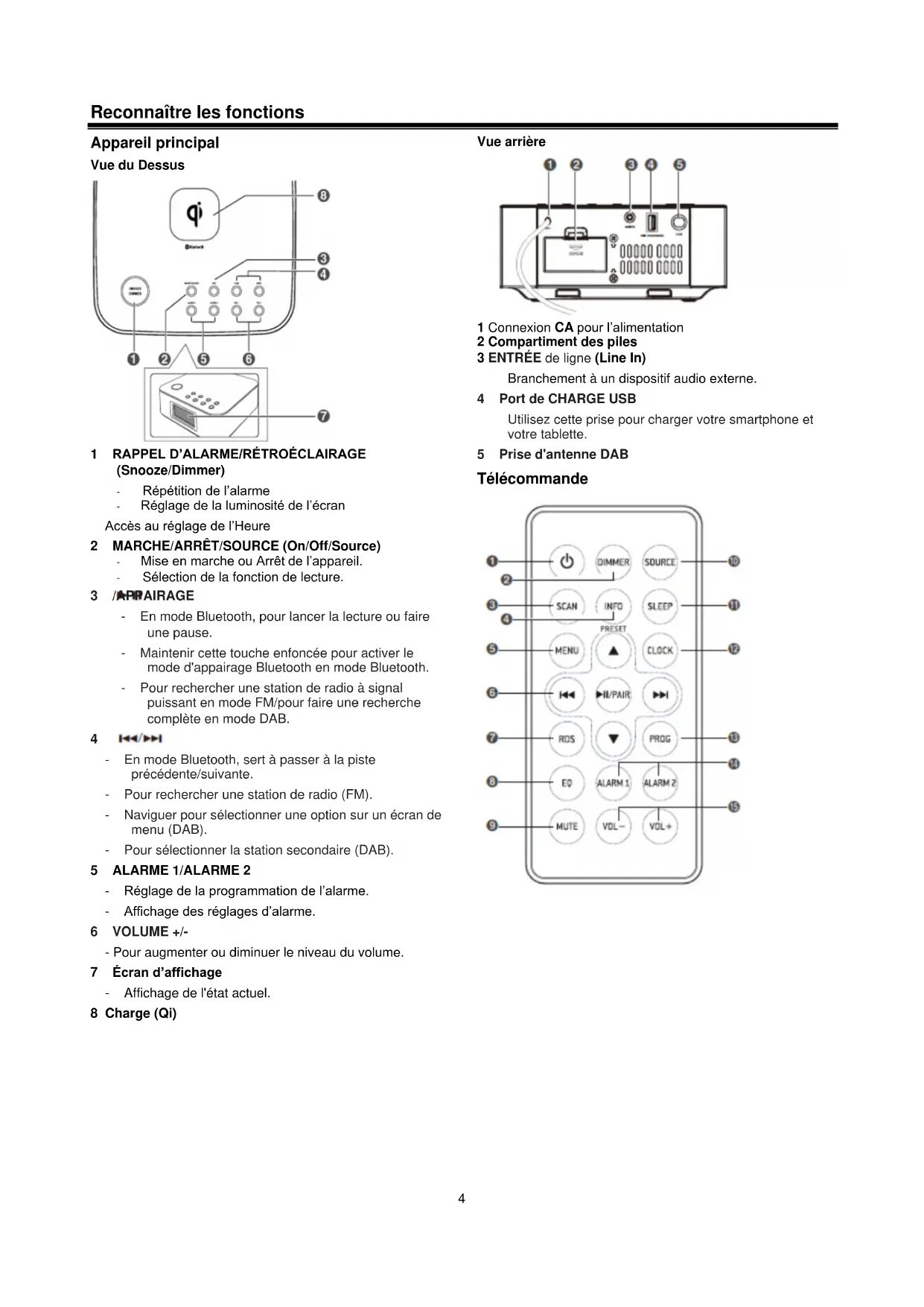 - En mode Bluetooth, sert à passer à la piste précédente/suivante. - Pour rechercher une station de radio (FM). - Naviguer pour sélectionner une option sur un écran de menu (DAB). - Pour sélectionner la station secondaire (DAB). 5 ALARME 1/ALARME 2 - Réglage de la programmation de l’alarme. - Affichage des réglages d’alarme. 6 VOLUME +/- - Pour augmenter ou diminuer le niveau du volume. 7 Écran d’affichage - Affichage de l'état actuel. 8 Charge (Qi) Vue arrière 1 Connexion CA pour l’alimentation 2 Compartiment des piles 3 ENTRÉE de ligne (Line In) Branchement à un dispositif audio externe. 4 Port de CHARGE USB Utilisez cette prise pour charger votre smartphone et votre tablette. 5 Prise d'antenne DAB Télécommande5