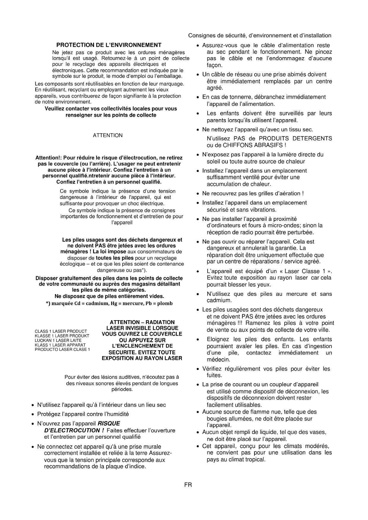 N'utilisez l'appareil qu’à l’intérieur dans un lieu sec Protégez l’appareil contre l’humidité N’ouvrez pas l’appareil RISQUE D’ELECTROCUTION ! Faites effectuer l’ouverture et l’entretien par un personnel qualifié Ne connectez cet appareil qu'à une prise murale correctement installée et reliée à la terre Assurez- vous que la tension principale corresponde aux recommandations de la plaque d’indice. Assurez-vous que le câble d’alimentation reste au sec pendant le fonctionnement. Ne pincez pas le câble et ne l’endommagez d’aucune façon. Un câble de réseau ou une prise abimés doivent être immédiatement remplacés par un centre agréé. En cas de tonnerre, débranchez immédiatement l’appareil de l’alimentation. Les enfants doivent être surveillés par leurs parents lorsqu’ils utilisent l’appareil. Ne nettoyez l’appareil qu’avec un tissu sec. N’utilisez PAS de PRODUITS DETERGENTS ou de CHIFFONS ABRASIFS ! N’exposez pas l’appareil à la lumière directe du soleil ou toute autre source de chaleur Installez l’appareil dans un emplacement suffisamment ventilé pour éviter une accumulation de chaleur. Ne recouvrez pas les grilles d’aération ! Installez l’appareil dans un emplacement sécurisé et sans vibrations. Ne pas installer l’appareil à proximité d’ordinateurs et fours à micro-ondes; sinon la réception de radio pourrait être perturbée. Ne pas ouvrir ou réparer l’appareil. Cela est dangereux et annulerait la garantie. La réparation doit être uniquement effectuée que par un centre de réparations / service agréé. L’appareil est équipé d’un « Laser Classe 1 ». Evitez toute exposition au rayon laser car cela pourrait blesser les yeux. N’utilisez que des piles au mercure et sans cadmium. Les piles usagées sont des déchets dangereux et ne doivent PAS être jetées avec les ordures ménagères !!! Ramenez les piles à votre point de vente ou aux points de collecte de votre ville. Eloignez les piles des enfants. Les enfants pourraient avaler les piles. En cas d’ingestion d’une pile, contactez immédiatement un médecin. Vérifiez régulièrement vos piles pour éviter les fuites. La prise de courant ou un coupleur d’appareil est utilisé comme dispositif de déconnexion, les dispositifs de déconnexion doivent rester facilement utilisables. Aucune source de flamme nue, telle que des bougies allumées, ne doit être placée sur l’appareil. Aucun objet rempli de liquide, tel que des vases, ne doit être placé sur l’appareil. Cet appareil, conçu pour les climats modérés, ne convient pas pour une utilisation dans les pays au climat tropical.URD480 / Français Manuel d’instructions