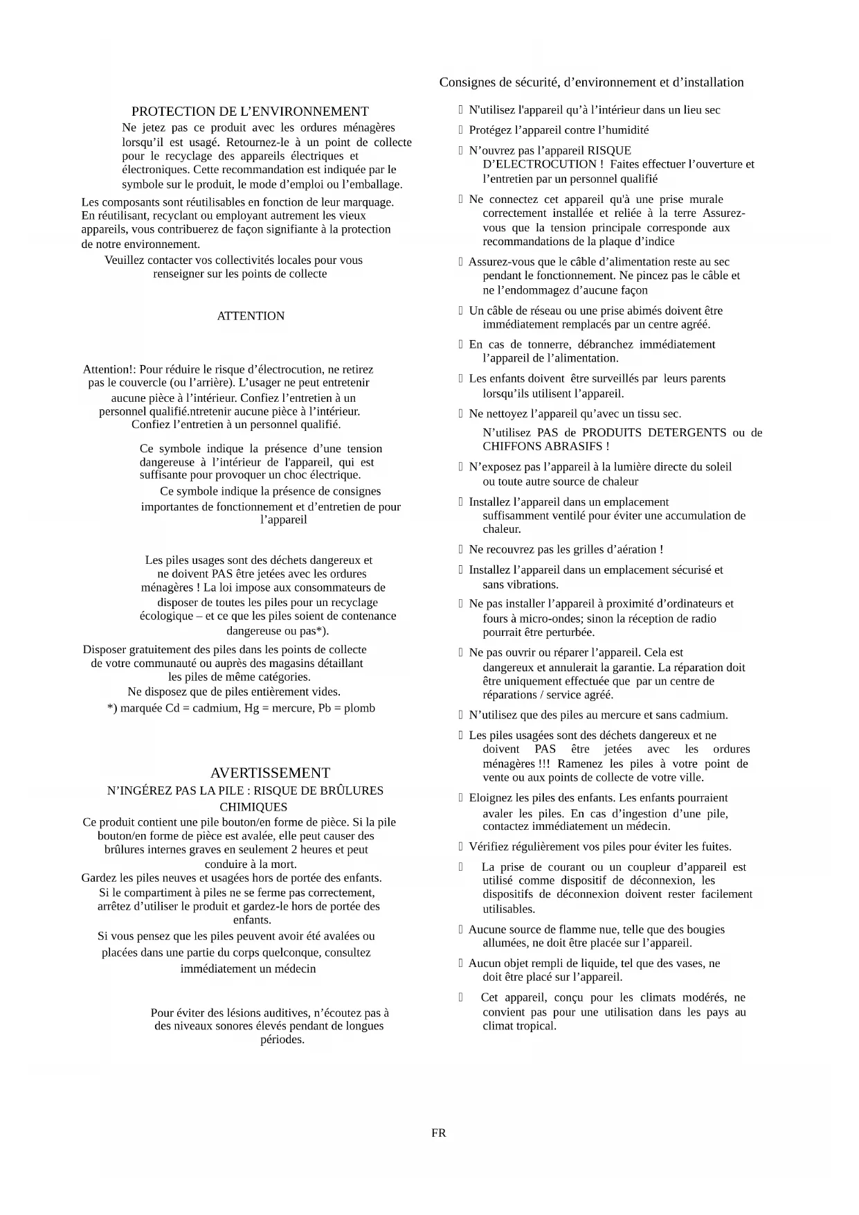 AVERTISSEMENT N’INGÉREZ PAS LA PILE : RISQUE DE BRÛLURES CHIMIQUES Ce produit contient une pile bouton/en forme de pièce. Si la pile bouton/en forme de pièce est avalée, elle peut causer des brûlures internes graves en seulement 2 heures et peut conduire à la mort. Gardez les piles neuves et usagées hors de portée des enfants. Si le compartiment à piles ne se ferme pas correctement, arrêtez d’utiliser le produit et gardez-le hors de portée des enfants. Si vous pensez que les piles peuvent avoir été avalées ou placées dans une partie du corps quelconque, consultez immédiatement un médecin