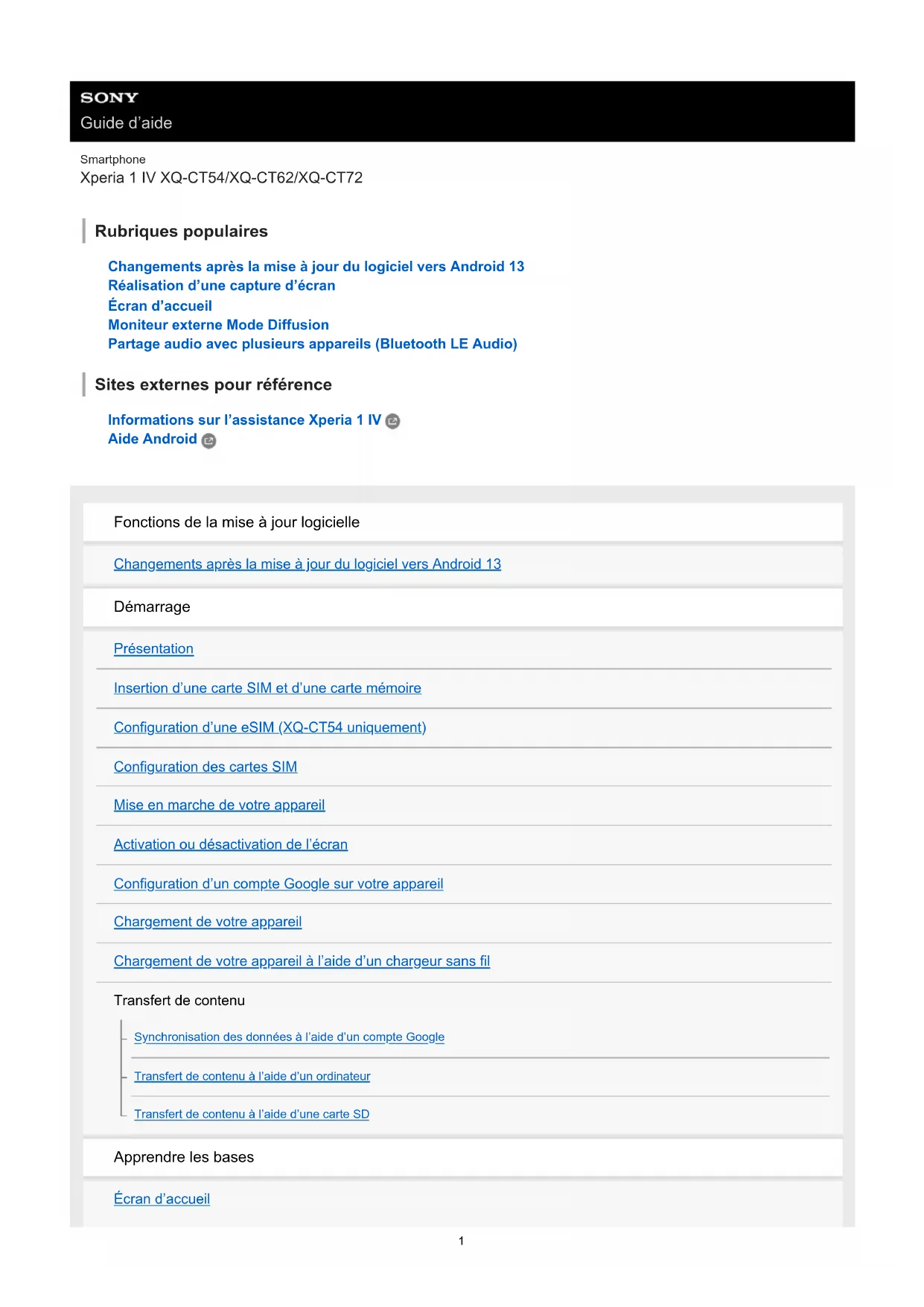 Guide d’aide Smartphone Xperia 1 IV XQ-CT54/XQ-CT62/XQ-CT72 Rubriques populaires Changements après la mise à jour du logiciel vers Android 13 Réalisation d’une capture d’écran Écran d’accueil Moniteur externe Mode Diffusion Partage audio avec plusieurs appareils (Bluetooth LE Audio) Sites externes pour référence Informations sur l’assistance Xperia 1 IV Aide Android Fonctions de la mise à jour logicielle Changements après la mise à jour du logiciel vers Android 13 Démarrage Présentation Insertion d’une carte SIM et d’une carte mémoire Configuration d’une eSIM (XQ-CT54 uniquement) Configuration des cartes SIM Mise en marche de votre appareil Activation ou désactivation de l’écran Configuration d’un compte Google sur votre appareil Chargement de votre appareil Chargement de votre appareil à l’aide d’un chargeur sans fil Transfert de contenu Synchronisation des données à l’aide d’un compte Google Transfert de contenu à l’aide d’un ordinateur Transfert de contenu à l’aide d’une carte SD Apprendre les bases Écran d’accueil 1Réalisation d’une capture d’écran Enregistrement de l’écran de votre appareil Scanner des QR codes Réglage du temps d’inactivité avant la désactivation de l’écran Contrôle intelligent du rétro-éclairage Utilisation du Détection latérale Réglage des autres options de la fonction Détection latérale Mode écran fractionné Mode fenêtre contextuelle Mode une main Alarme Voyant de notification Icônes de la barre d’état Barre d’état et panneau de notification Icônes d’état Icônes de notification Photo Pro (Photography Pro) Découverte de Photo Pro Mode BASIC (Basique) Présentation du mode BASIC (Basique) Prise d’une photo ou enregistrement d’une vidéo Visionnage de photos et de vidéos Scanner des QR codes Fonctions fréquemment utilisées en mode BASIC (Basique) Selfies Prise d’un selfie Prise d’un selfie à l’aide de l’obturateur manuel Réglages du mode BASIC (Basique) Couleur et luminosité 2Effet bokeh Enregistrement vidéo HDR Gam. dynam. Enregistrement d’une vidéo stable Utilisation des différents modes de capture d’images Sélection d’un mode de capture d’images Vidéos au ralenti Édition de selfie Images panoramiques Effet créatif Utilisation des modes AUTO/P/S/M Présentation du mode AUTO/P/S/M Menu des fonctions Prise d’images fixes Sélection d’un mode de prise de vue Mode Auto (AUTO) Programme Auto (P) Vitesse de l'obturateur prioritaire (S) Exposition manuelle (M) Enregistrement et rappel des réglages de l’appareil photo Mémoire des réglages de prise de vue Rappel de mémoire (MR) Sélection de l’entraînement (prise de vue en continu/retardateur) Prise de vue en continu Retardateur Utilisation du flash Reconnaissance de la scène et des conditions Autres réglages de l’appareil photo Réglage de la mise au point en touchant le viseur AF sur le visage/les yeux (image fixe/vidéo) 3Adoucissement du teint de la peau Suivi d’un sujet Configuration de l’Mode Transfer & Tagging add-on Stockage des données Géolocalisation Lignes de la grille Différentes utilisations possibles du bouton de volume Signaux audio Video Pro (Videography Pro) Lancement de Video Pro Menu de Video Pro Paramètres de Video Pro Mode Diffusion de Video Pro Cinema Pro (Cinematography Pro) Lancement de l’application Cinema Pro Combinaison de clips et visionnage d’un film Music Pro Music Pro Musique Transfert de musique depuis un ordinateur vers votre appareil Écouter de la musique Fonctions de l’application Musique Optimiseur de jeu Lancement de l’application Optimiseur de jeu Utilisation du menu Optimiseur de jeu Réglage de la qualité d’image et du son dans le menu Optimiseur de jeu Diffusion en direct à l’aide de l’Optimiseur de jeu Moniteur externe 4Utilisation de l’application Moniteur externe Moniteur externe Mode Diffusion Réglages audio du Moniteur externe Mode Endurance de l'écran Application Assistance À propos de l’application Assistance Réglages Menu Paramètres Volume, vibration et son Volume et vibration Sons et tonalités Réglages de l’écran Utilisation des services de géolocalisation Date et heure Gestion de l’alimentation Entretien batterie Mode STAMINA Gestion de la batterie et de l’alimentation Vérification de la consommation de batterie des applications Amélioration du son Amélioration de la qualité du son avec Dolby Sound Personnalisation de la qualité sonore à l’aide de 360 Reality Audio Amélioration de la qualité du son avec 360 Upmix Amélioration de la qualité des fichiers de musique compressés (DSEE Ultimate) Réduction du bruit du vent lors de l’enregistrement Vibration dynamique Utilisation de la vibration dynamique Définition des réglages de la fonction Vibration dynamique Affichage en mode Veille 5Gestion intelligente appels Maintenance Mise à jour de votre appareil Avant la mise à jour de votre périphérique Mise à jour sans fil de votre appareil Mises à jour de l’application Redémarrage, réinitialisation et réparation Redémarrage et réinitialisation de votre appareil Réparation du logiciel de l’appareil à l’aide de Xperia Companion Réinitialisation de vos applications Amélioration des performances de la mémoire Affichage de l’état de la mémoire Libération d’espace sur la mémoire interne Arrêt de l’exécution des applications et des services Formatage de la carte mémoire Internet et réseaux Connexion aux données mobiles Augmentation de l’intensité du signal Wi-Fi