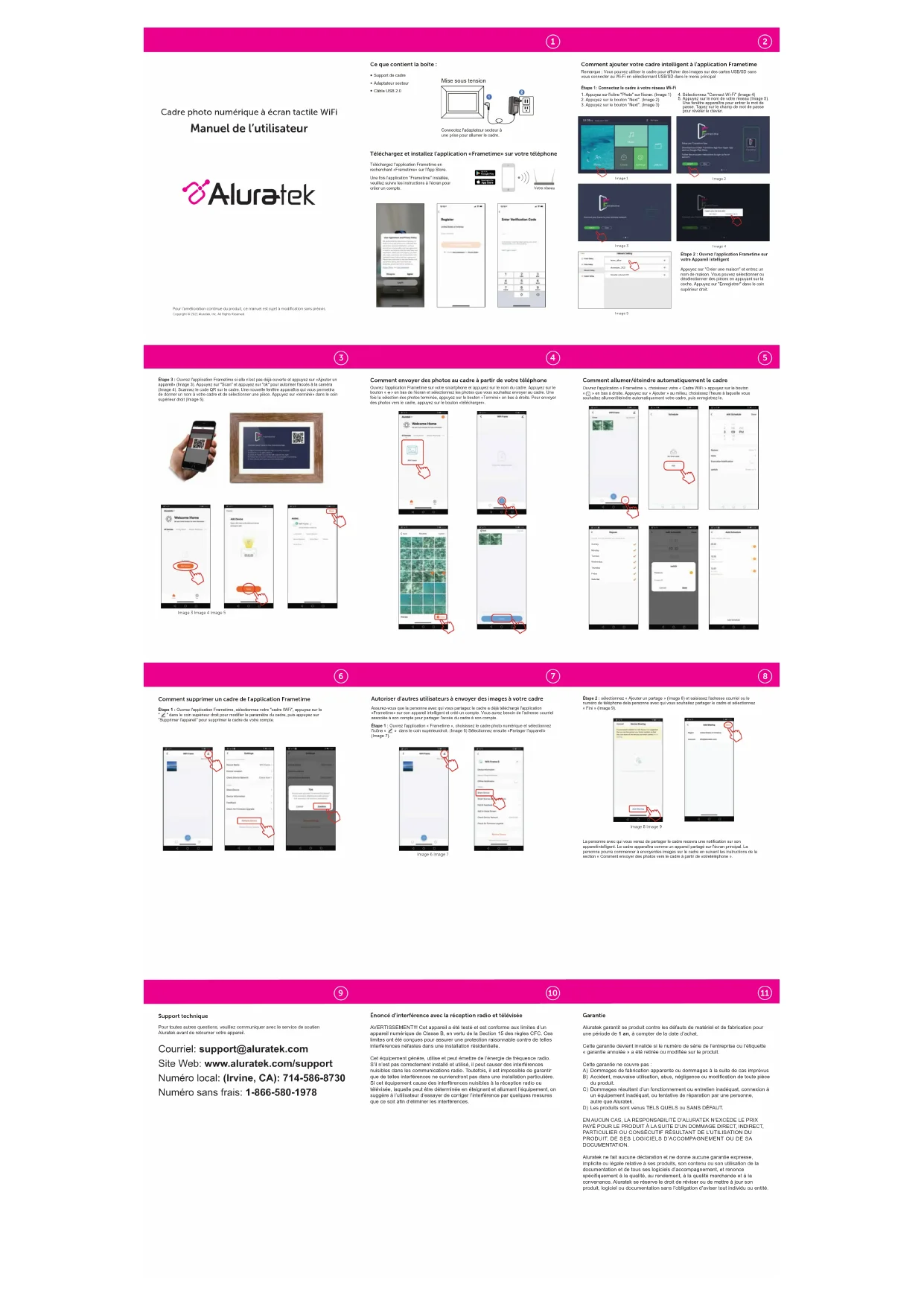 Connectez l'adaptateur secteur àune prise pour allumer le cadre. Téléchargez et installez l'application «Frametime» sur votre téléphone Téléchargez l'application Frametime en recherchant «Frametime» sur l'App Store.Une fois l'application "Frametime" installée, veuillez suivre les instructions à l'écran pour créer un compte.Votre réseau Ce que contient la boîte : Mise sous tension Support de cadre Adaptateur secteur Câble USB 2.0Pour l'amélioration continue du produit, ce manuel est sujet à modification sans préavis. Manuel de l’utilisateur Copyright © 2021 Aluratek, Inc. All Rights Reserved. Cadre photo numérique à écran tactile WiFi Comment supprimer un cadre de l'application Frametime Étape 1 : Ouvrez l'application Frametime, sélectionnez votre "cadre WiFi", appuyez sur le " " dans le coin supérieur droit pour modifier le paramètre du cadre, puis appuyez sur "Supprimer l'appareil" pour supprimer le cadre de votre compte.Image 6 Image 7
