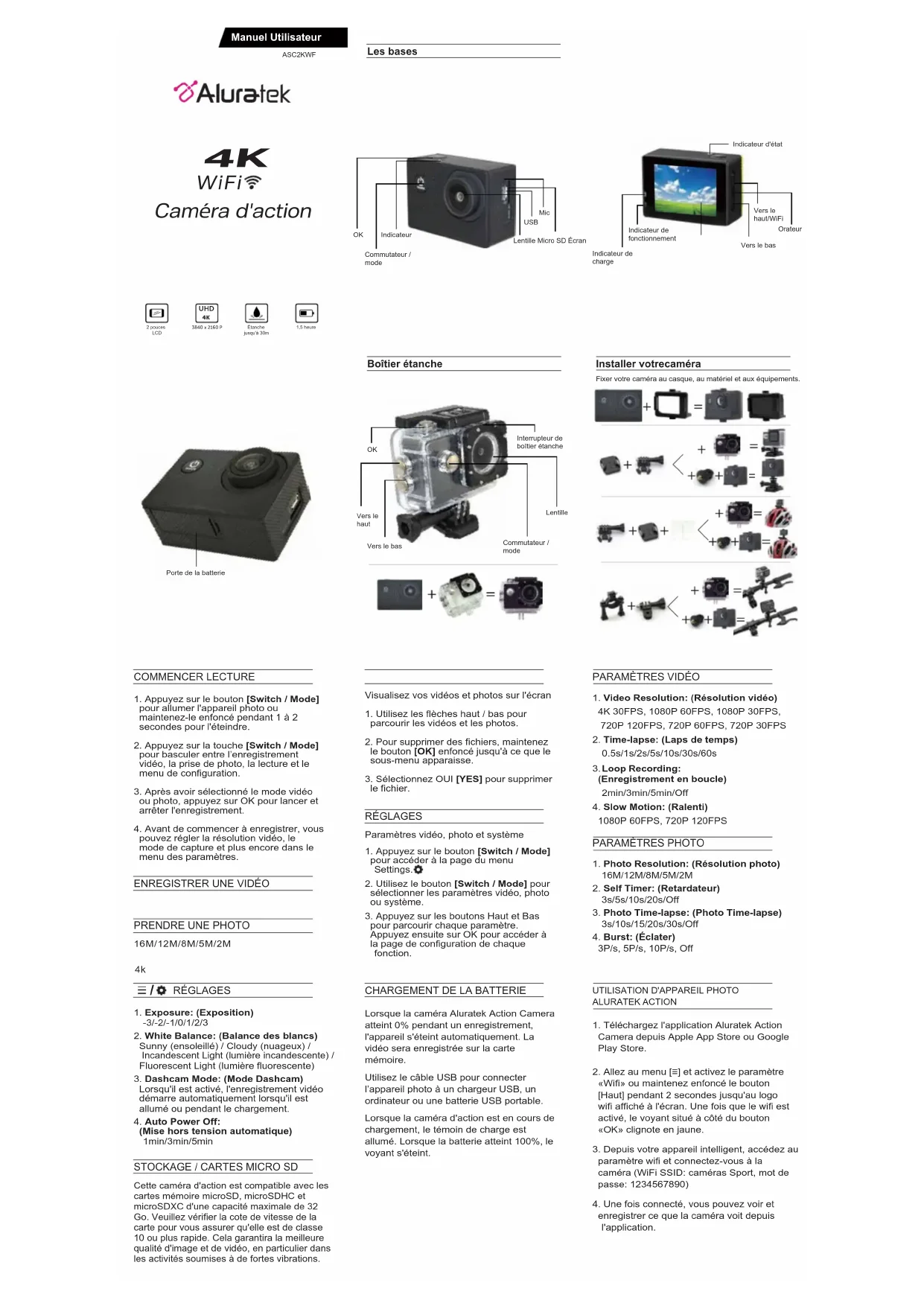 WiFi ASC2KWF1. Appuyez sur le bouton [Switch / Mode] pour allumer l'appareil photo ou maintenez-le enfoncé pendant 1 à 2 secondes pour l'éteindre.2. Appuyez sur la touche [Switch / Mode] pour basculer entre l’enregistrement vidéo, la prise de photo, la lecture et le menu de configuration.3. Après avoir sélectionné le mode vidéo ou photo, appuyez sur OK pour lancer et arrêter l'enregistrement.4. Avant de commencer à enregistrer, vous pouvez régler la résolution vidéo, le mode de capture et plus encore dans le menu des paramètres.Cette caméra d'action est compatible avec les cartes mémoire microSD, microSDHC et microSDXC d'une capacité maximale de 32 Go. Veuillez vérifier la cote de vitesse de la carte pour vous assurer qu'elle est de classe 10 ou plus rapide. Cela garantira la meilleure qualité d'image et de vidéo, en particulier dans les activités soumises à de fortes vibrations.Lorsque la caméra Aluratek Action Camera atteint 0% pendant un enregistrement, l'appareil s'éteint automatiquement. La vidéo sera enregistrée sur la carte mémoire.Utilisez le câble USB pour connecter l’appareil photo à un chargeur USB, un ordinateur ou une batterie USB portable.Lorsque la caméra d'action est en cours de chargement, le témoin de charge est allumé. Lorsque la batterie atteint 100%, le voyant s'éteint.Visualisez vos vidéos et photos sur l'écran1. Utilisez les flèches haut / bas pour parcourir les vidéos et les photos.2. Pour supprimer des fichiers, maintenez le bouton [OK] enfoncé jusqu'à ce que le sous-menu apparaisse.3. Sélectionnez OUI [YES] pour supprimer le fichier.Paramètres vidéo, photo et système1. Appuyez sur le bouton [Switch / Mode] pour accéder à la page du menu Settings.2. Utilisez le bouton [Switch / Mode] pour sélectionner les paramètres vidéo, photo ou système.3. Appuyez sur les boutons Haut et Bas pour parcourir chaque paramètre. Appuyez ensuite sur OK pour accéder à la page de configuration de chaque fonction.16M/12M/8M/5M/2M