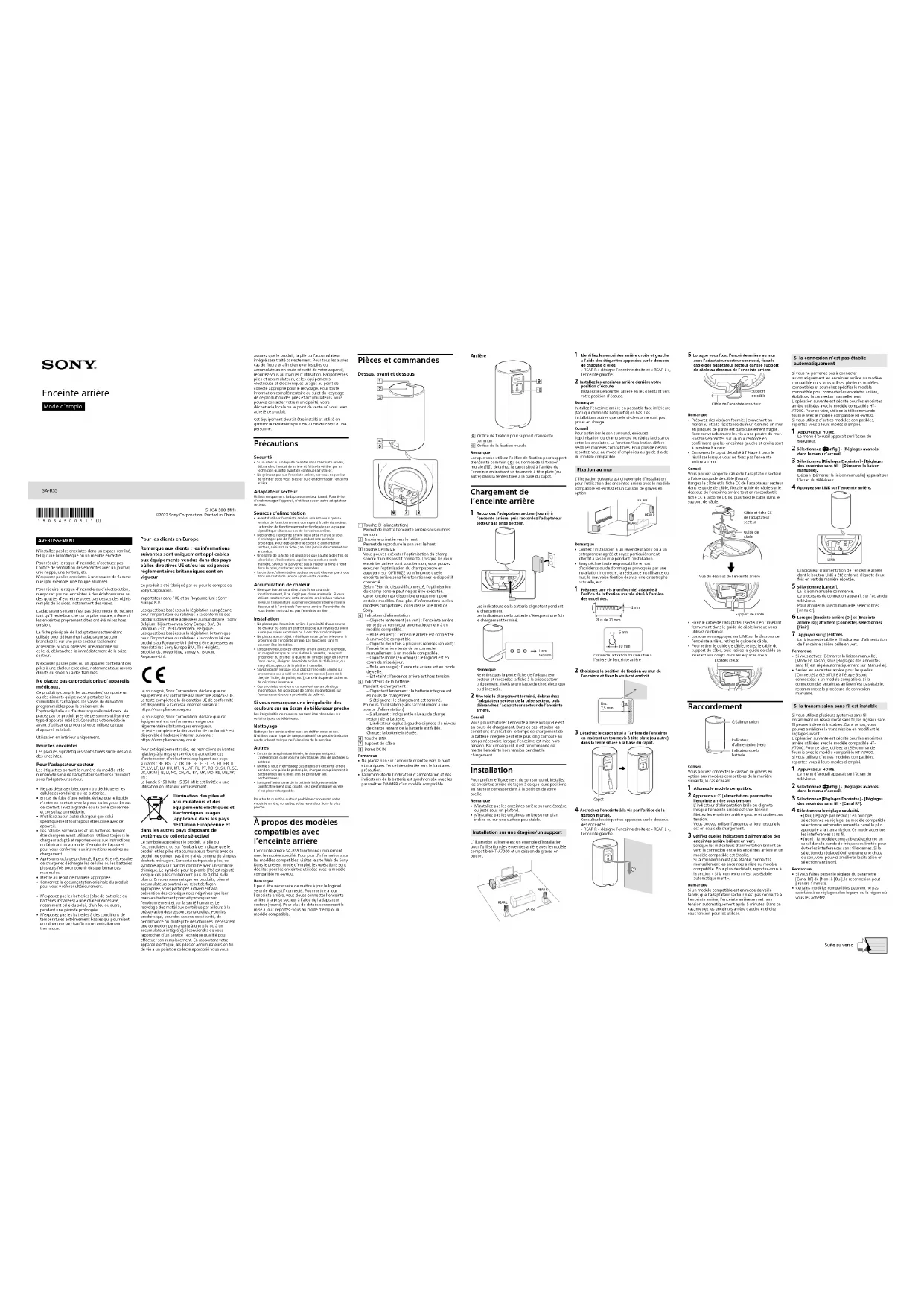 Enceinte arrière Mode d’emploi SA-RS5 5-034-500-51(1)©2022 Sony Corporation Printed in China AVERTISSEMENT N’installez pas les enceintes dans un espace confiné, tel qu’une bibliothèque ou un meuble encastré.Pour réduire le risque d’incendie, n’obstruez pas l’orifice de ventilation des enceintes avec un journal, une nappe, une tenture, etc. N’exposez pas les enceintes à une source de flamme nue (par exemple, une bougie allumée).Pour réduire le risque d’incendie ou d’électrocution, n’exposez pas ces enceintes à des éclaboussures ou des gouttes d’eau et ne posez pas dessus des objets remplis de liquides, notamment des vases.L’adaptateur secteur n’est pas déconnecté du secteur tant qu’il reste branché sur la prise murale, même si les enceintes proprement dites ont été mises hors tension.La fiche principale de l’adaptateur secteur étant utilisée pour débrancher l’adaptateur secteur, branchez-la sur une prise secteur facilement accessible. Si vous observez une anomalie sur celle-ci, débranchez-la immédiatement de la prise secteur.N’exposez pas les piles ou un appareil contenant des piles à une chaleur excessive, notamment aux rayons directs du soleil ou à des flammes. Ne placez pas ce produit près d’appareils médicaux. Ce produit (y compris les accessoires) comporte un ou des aimants qui peuvent perturber les stimulateurs cardiaques, les valves de dérivation programmables pour le traitement de l’hydrocéphalie ou d’autres appareils médicaux. Ne placez pas ce produit près de personnes utilisant ce type d’appareil médical. Consultez votre médecin avant d’utiliser ce produit si vous utilisez ce type d’appareil médical.Utilisation en intérieur uniquement. Pour les enceintes Les plaques signalétiques sont situées sur le dessous des enceintes. Pour l’adaptateur secteur Les étiquettes portant le numéro du modèle et le numéro de série de l’adaptateur secteur se trouvent sous l’adaptateur secteur.• Ne pas désassembler, ouvrir ou déchiqueter les cellules secondaires ou les batteries.• En cas de fuite d’une cellule, évitez que le liquide n’entre en contact avec la peau ou les yeux. En cas de contact, lavez à grande eau la zone concernée et consultez un médecin.• N’utilisez aucun autre chargeur que celui spécifiquement fourni pour être utilisé avec cet appareil.• Les cellules secondaires et les batteries doivent être chargées avant utilisation. Utilisez toujours le chargeur adapté et reportez-vous aux instructions du fabricant ou au mode d’emploi de l’appareil pour vous conformer aux instructions relatives au chargement.• Après un stockage prolongé, il peut être nécessaire de charger et décharger les cellules ou les batteries plusieurs fois pour obtenir des performances maximales.• Mettre au rebut de manière appropriée.• Conservez la documentation originale du produit pour vous y référer ultérieurement.• N’exposez pas les batteries (bloc de batteries ou batteries installées) à une chaleur excessive, notamment celle du soleil, d’un feu ou autre, pendant une période prolongée.• N’exposez pas les batteries à des conditions de températures extrêmement basses qui pourraient entraîner une surchauffe ou un emballement thermique. Pour les clients en Europe Remarque aux clients : les informations suivantes sont uniquement applicables aux équipements vendus dans des pays où les directives UE et/ou les exigences réglementaires britanniques sont en vigueur Ce produit a été fabriqué par ou pour le compte de Sony Corporation.Importateur dans l’UE et au Royaume-Uni : Sony Europe B.V.Les questions basées sur la législation européenne pour l’importateur ou relatives à la conformité des produits doivent être adressées au mandataire : Sony Belgium, bijkantoor van Sony Europe B.V., Da Vincilaan 7-D1, 1930 Zaventem, Belgique.Les questions basées sur la législation britannique pour l’importateur ou relatives à la conformité des produits au Royaume-Uni doivent être adressées au mandataire : Sony Europe B.V., The Heights, Brooklands, Weybridge, Surrey KT13 0XW, Royaume-Uni.Le soussigné, Sony Corporation, déclare que cet équipement est conforme à la Directive 2014/53/UE.Le texte complet de la déclaration UE de conformité est disponible à l’adresse internet suivante : https://compliance.sony.euLe soussigné, Sony Corporation, déclare que cet équipement est conforme aux exigences réglementaires britanniques en vigueur.Le texte complet de la déclaration de conformité est disponible à l’adresse internet suivante :https://compliance.sony.co.ukPour cet équipement radio, les restrictions suivantes relatives à la mise en service ou aux exigences d’autorisation d’utilisation s’appliquent aux pays suivants : BE, BG, CZ, DK, DE, EE, IE, EL, ES, FR, HR, IT, CY, LV, LT, LU, HU, MT, NL, AT, PL, PT, RO, SI, SK, FI, SE, UK, UK(NI), IS, LI, NO, CH, AL, BA, MK, MD, RS, ME, XK, TR : La bande 5 150 MHz - 5 350 MHz est limitée à une utilisation en intérieur exclusivement. Elimination des piles et accumulateurs et des équipements électriques et électroniques usagés (applicable dans les pays de l’Union Européenne et dans les autres pays disposant de systèmes de collecte sélective) Ce symbole apposé sur le produit, la pile ou l’accumulateur, ou sur l’emballage, indique que le produit et les piles et accumulateurs fournis avec ce produit ne doivent pas être traités comme de simples déchets ménagers. Sur certains types de piles, ce symbole apparaît parfois combiné avec un symbole chimique. Le symbole pour le plomb (Pb) est rajouté lorsque ces piles contiennent plus de 0,004 % de plomb. En vous assurant que les produits, piles et accumulateurs sont mis au rebut de façon appropriée, vous participez activement à la prévention des conséquences négatives que leur mauvais traitement pourrait provoquer sur l’environnement et su