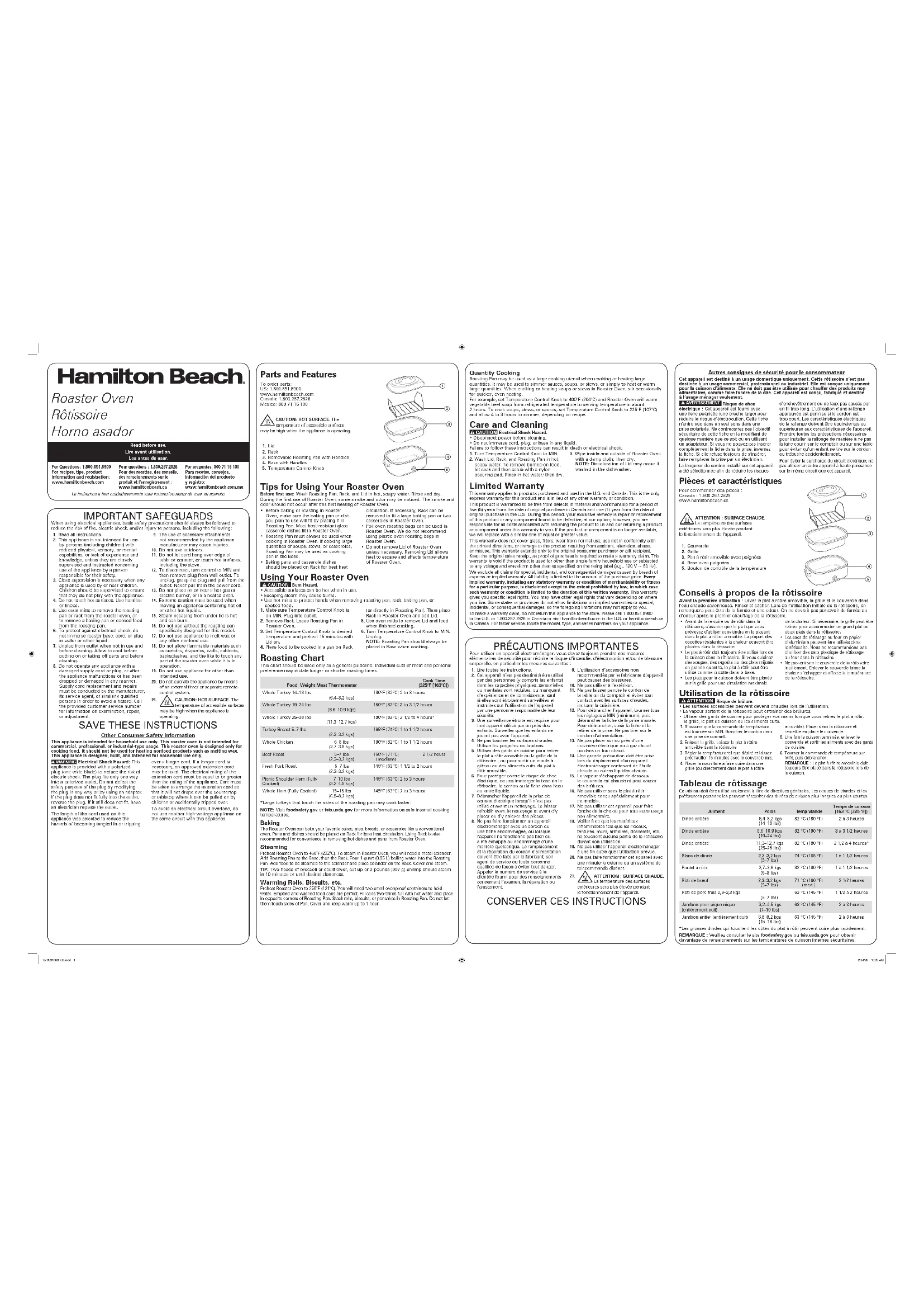 - Si no existe Centro de Servicio Autorizado en su localidad llame a nuestro Centro de Atención al Consumidor para recibir instrucciones de como hacer efectiva su garantía.FECHA DE ENTREGASELLO DEL VENDEDORQUEJAS Y SUGERENCIASDÍA___ MES___ AÑO___Si desea hacer comentarios o sugerencias con respecto a nuestro servicio o tiene alguna queja derivada de la atención recibida en alguno de nuestros Centros de Servicio Autorizados, por favor dirigirse a:GERENCIA INTERNACIONAL DE SERVICIO 800 71 16 100Email: mexico.service@hamiltonbeach.comCENTROS DE SERVICIO AUTORIZADOSCiudad de MéxicoELECTRODOMÉSTICOSAv. Plutarco Elias Calles No. 1499 Zacahuitzco, Benito Juárez, Ciudad de México, C.P. 09490 Tel: 55 5235 2323 CASA GARCÍA Av. Patriotismo No. 875-B Mixcoac, Benito Juárez, Ciudad de México, C.P. 03910 Tel: 55 5563 8723 Nuevo LeónFERNANDO SEPÚLVEDA REFACCIONESRuperto Martínez No. 238 Ote.Col. Centro,Monterrey, N.L., C.P. 64000Tel: 81 8343 6700JaliscoSERVICIOS DE MANTENIMIENTO CASTILLOGaribaldi NO. 1450,Ladrón de Guevara,Guadalajara,Jalisco, C.P. 44660Tel: 33 3825 3480Modelos: Tipos Características Eléctricas:32210, 32215 RO14, RO15 120 V ~ 60 Hz 1450 WLos modelos incluídos en el instructivo de Uso y Cuidado pueden ir seguidos o no por un sufijo correspondiente a una o varias letras del alfabeto y sus combinaciones, separadas o no por un espacio, coma, diagonal, o guión. Como ejemplos los sufijos pueden ser: “Y” y/o “MX” y/o “MXY” y/o “Z”. Cuisson au four La rôtissoire peut cuire vos gâteaux, tartes, pains ou mets en sauce favoris comme un four conventionnel. Les plats doivent être placés sur la grille pour la meilleure circulation de la chaleur. L’utilisation de la grille est aussi recommandée pour la commodité de sortir les plats chauds de la rôtissoire. Étuvage Préchauffer la rôtissoire à 232 ºC (450 °F). Pour faire une cuisson vapeur dans la rôtissoire, vous devez utiliser une passoire en métal. Déposer le plat à rôtir dans la base, et ensuite la grille. Verser 0,95 L (1 pinte) d’eau bouillante dans le plat à rôtir. Ajouter les aliments à cuire à la vapeur dans la passoire et placer la passoire sur la grille. Couvrir et cuire à la vapeur. CONSEIL : Deux fleurons de brocoli ou de chou-fleur taillés en morceaux, ou 907 g (2 livres) de crevettes devraient être cuits à la vapeur pendant 10 minutes ou jusqu’au degré de cuisson souhaité. Réchauffage de petits pains et biscuits Préchauffer la rôtissoire à 121 ºC (250 ºF). Vous aurez besoin de deux petits contenants allant au four pour contenir l’eau. Les boîtes de conserve vides et lavées conviennent parfaitement. Remplir les boîtes aux deux tiers d’eau chaude et les placer dans les coins opposés du plat à rôtir amovible. Empiler les petits pains, biscuits ou crêpes dans le plat amovible. Ne pas les laisser toucher les côtés du plat. Couvrir et garder au chaud pendant 1 heure. Cuisson en quantité La plat à rôtir amovible peut servir pour la cuisson ou le réchauffage de grandes quantités. Il peut servir pour faire mijoter les sauces, soupes ou ragoûts, ou simplement pour faire chauffer ou réchauffer de grandes quantités. Lors de la cuisson ou de réchauffage de soupes ou de ragoûts dans la rôtissoire, remuer occasionnellement pour un réchauffage plus rapide et uniforme. Par exemple, régler la commande de température sur 204 ºC (400 ºF) et la rôtissoire réchauffera une soupe aux légumes et au boeuf d’une température réfrigérée à une température de service en environ deux heures. Pour faire cuire des soupes, ragoûts ou sauces, régler la commande de température sur 107 ºC (225 ºF) et prévoir 4 à 8 heures de mijotage selon la recette. Entretien et nettoyage w ATTENTION Risque de choc électrique.• Couper le courant avant le nettoyage. • Ne pas immerger le cordon d’alimentation, la fiche ou la base dans tout liquide. Le non-respect de ces instructions peut entraîner la mort ou un choc électrique. 1. Tourner le régulateur de température jusqu’à MIN.2. Laver le couvercle, la grille et le plat à rôtir amovible dans de l’eau chaude savonneuse. Pour enlever les aliments brûlés sur la surface, faire tremper, puis frotter avec un tampon de récurage en nylon. Rincer à l’eau chaude, puis sécher.3. Essuyer l’intérieur et l’extérieur de la rôtissoire avec un linge humide, puis sécher. REMARQUE : La décoloration du couvercle peut se produire si lavé dans le lave-vaisselle. Garantie limitée Cette garantie s’applique aux produits achetés et utilisées aux É.-U. et au Canada. C’est la seule garantie expresse pour ce produit et est en lieu et place de tout autre garantie ou condition.Ce produit est garanti contre tout défaut de matériaux et de main-d’oeuvre pour une période de cinq (5) ans à compter de la date d’achat d’origine au Canada et un (1) an à compter de la date d’achat d’origine aux É.-U. Au cours de cette période, votre seul recours est la réparation ou le remplacement de ce produit ou tout composant s’avérant défectueux, à notre gré, mais vous êtes responsable de tous les coûts liés à l’expédition du produit et le retour d’un produit ou d’un composant dans le cadre de cette garantie. Si le produit ou un composant n’est plus offert, nous le remplacerons par un produit similaire de valeur égale ou supérieure.Cette garantie ne couvre pas le verre, les filtres, l’usure d’un usage normal, l’utilisation non conforme aux directives imprimées, ou des dommages au produit résultant d’un accident, modification, utilisation abusive ou incorrecte. Cette garantie s’applique seulement à l’acheteur original ou à la personne l’ayant reçu en cadeau. La présentation du reçu de vente d’origine comme preuve d’achat est nécessaire pour faire une réclamation au titre de cette garantie. Cette garantie s’annule si le produit est utilisé autrement que par une f