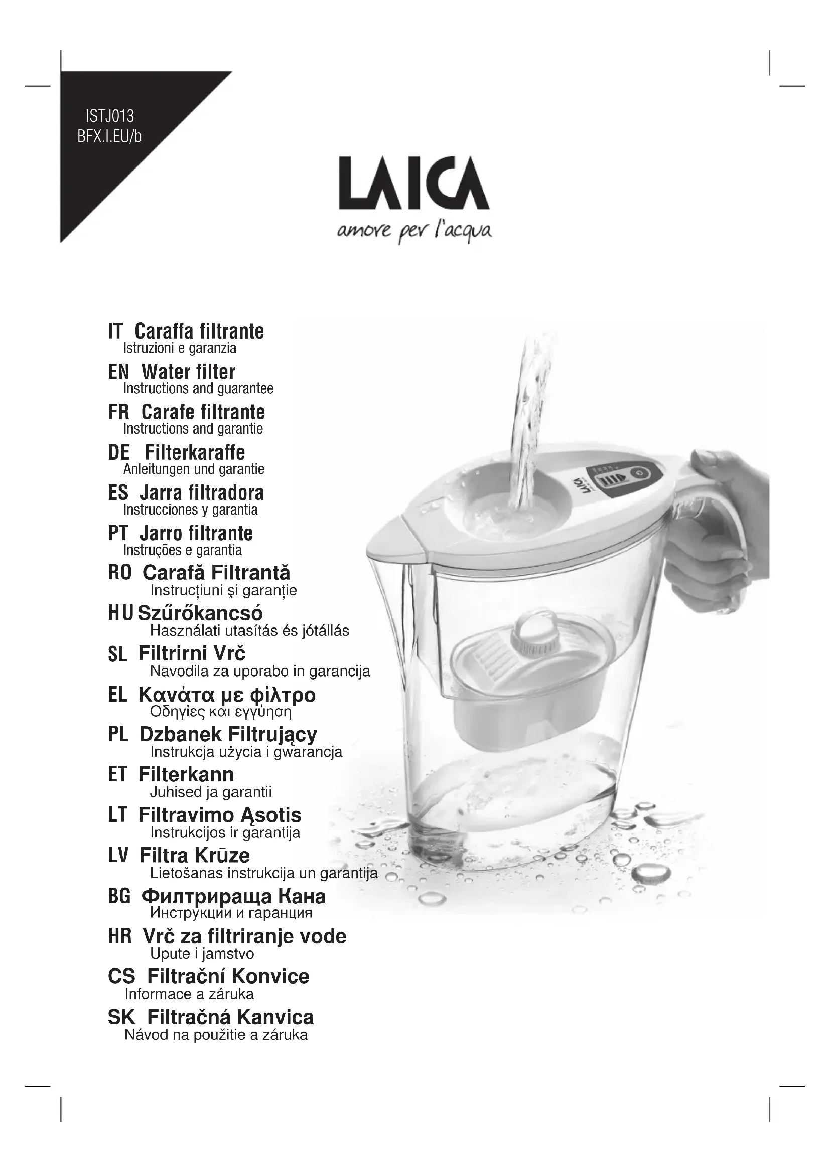 La carafe Laica est un appareil destiné au contrôle des eaux potables. La carafe filtre l'eau potable du réseau de distribution grâce à une cartouche qui améliore le goût de l'eau en réduisant certaines substances non désirées éventuellement générées. Toutes les cartouches Laica sont fabriquées en Italie et sont toujours soumises aux procédés de stérilisation. Les cartouches Laica sont composées de charbons actifs végétaux, argent et résines d'ions. Les charbons actifs sont efficaces pour réduire le chlore et ses dérivés. Les résines d'ions sont efficaces pour réduire les métaux lourds éventuellement générés dans l'eau du robinet. Pour un usage raisonnable, demander plus d'informations à l'opérateur du réseau hydrique ou bien effectuer un test de l'eau du robinet.