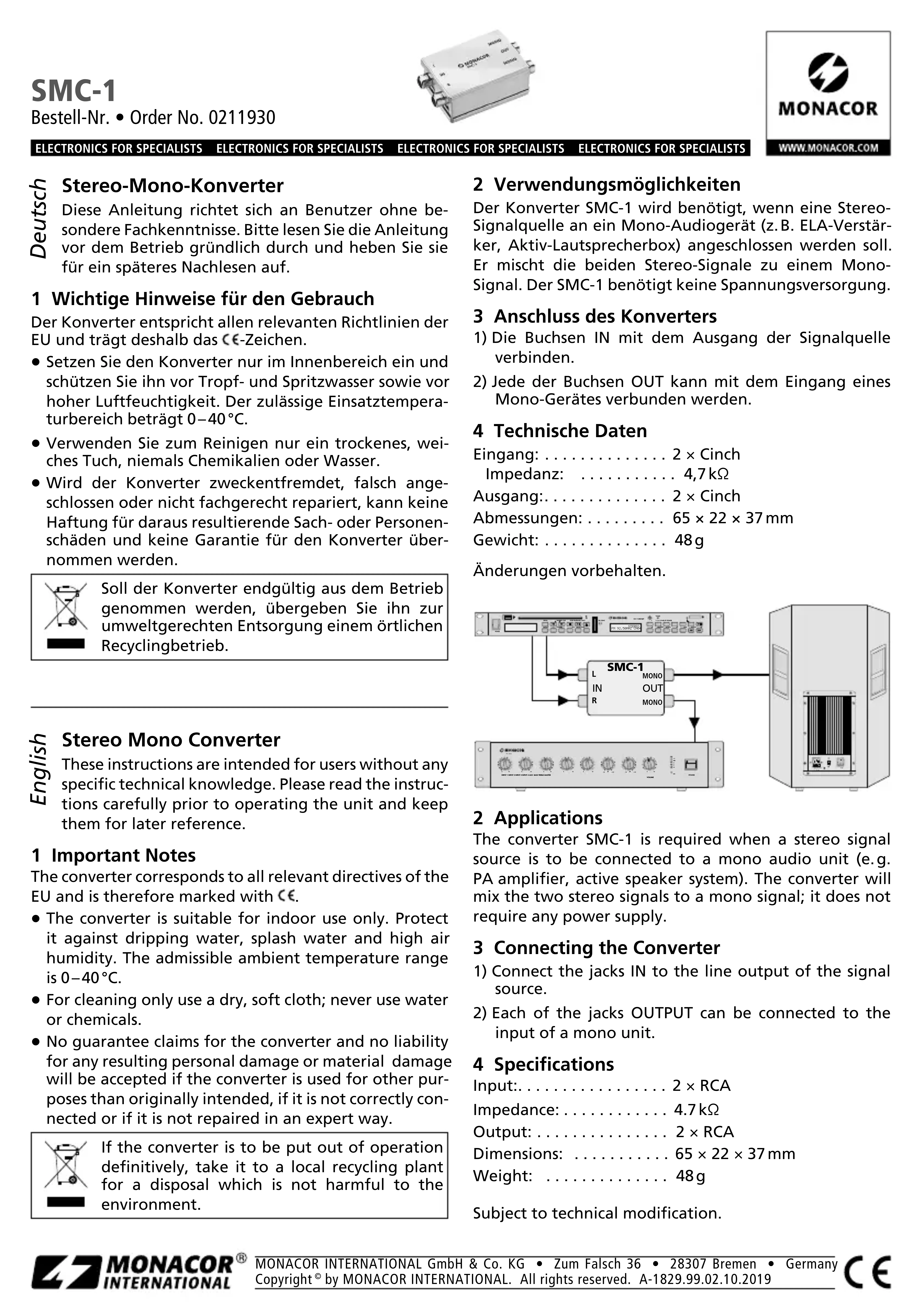 - × 22 × 37 mm Peso: g Con riserva di modifiche tecniche. SMC-1 Référence num. • Codice 0211930 Convertisseur stéréo mono Cette notice s’adresse à l’utilisateur sans connais- sance technique particulière. Veuillez lire la présente notice avant le fonctionnement et conservez-la pour pouvoir vous y reporter ultérieurement. 1 Conseils importants d’utilisation Le convertisseur répond à toutes les directives nécessaires de l’Union européenne et porte donc le symbole p. 48
