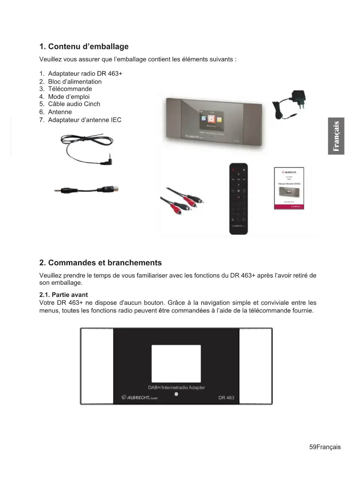 Veuillez prendre le temps de vous familiariser avec les fonctions du DR 463+ après l’avoir retiré de son emballage. 2.1. Partie avant Votre DR 463+ ne dispose d'aucun bouton. Grâce à la navigation simple et conviviale entre les menus, toutes les fonctions radio peuvent être commandées à l’aide de la télécommande fournie.60 Français Français 2.2. Partie arrière Les branchements de ce modèle sont :