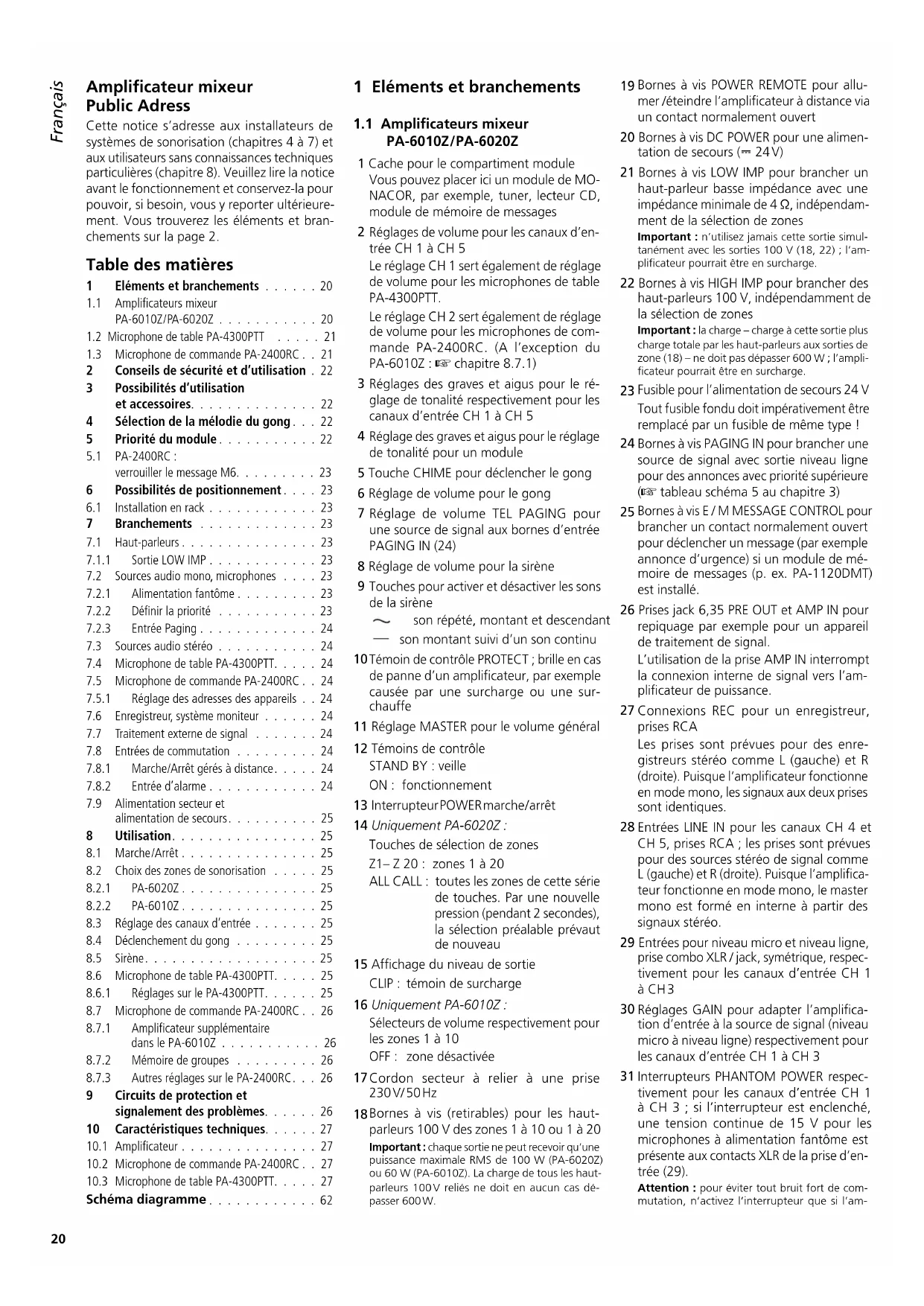 vis. 9 Circuits de protection et signalement des problèmes Les amplificateurs de puissance du PA-6010Z et du PA-6020Z sont dotés de circuits de pro- tection contre les surcharge et surchauffe pour éviter tout dommage sur les haut-parleurs et l’amplificateur. Si la LED PROTECT (10) brille, le circuit de protection est activé, il y a un problème. Dans ce cas, il faut débrancher l’appareil de son alimentation et rechercher le problème. Sur le microphone de commande PA-2400RC, la LED MIC FAULT (55) signale que le micro- phone est en panne.27 Français 10 Caractéristiques techniques
