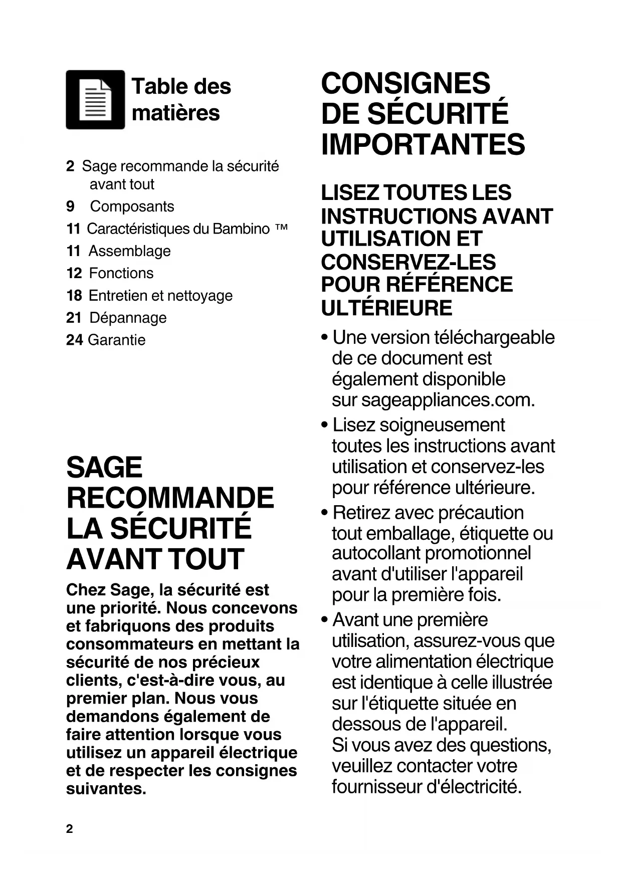 - Avant une première utilisation, assurez-vous que votre alimentation électrique est identique à celle illustrée sur l'étiquette située en dessous de l'appareil. Si vous avez des questions, veuillez contacter votre fournisseur d'électricité. Table des matières 2 Sage recommande la sécurité avant tout9 Composants11 Caractéristiques du Bambino 11 Assemblage12 Fonctions18 Entretien et nettoyage21 Dépannage24 Garantie3
