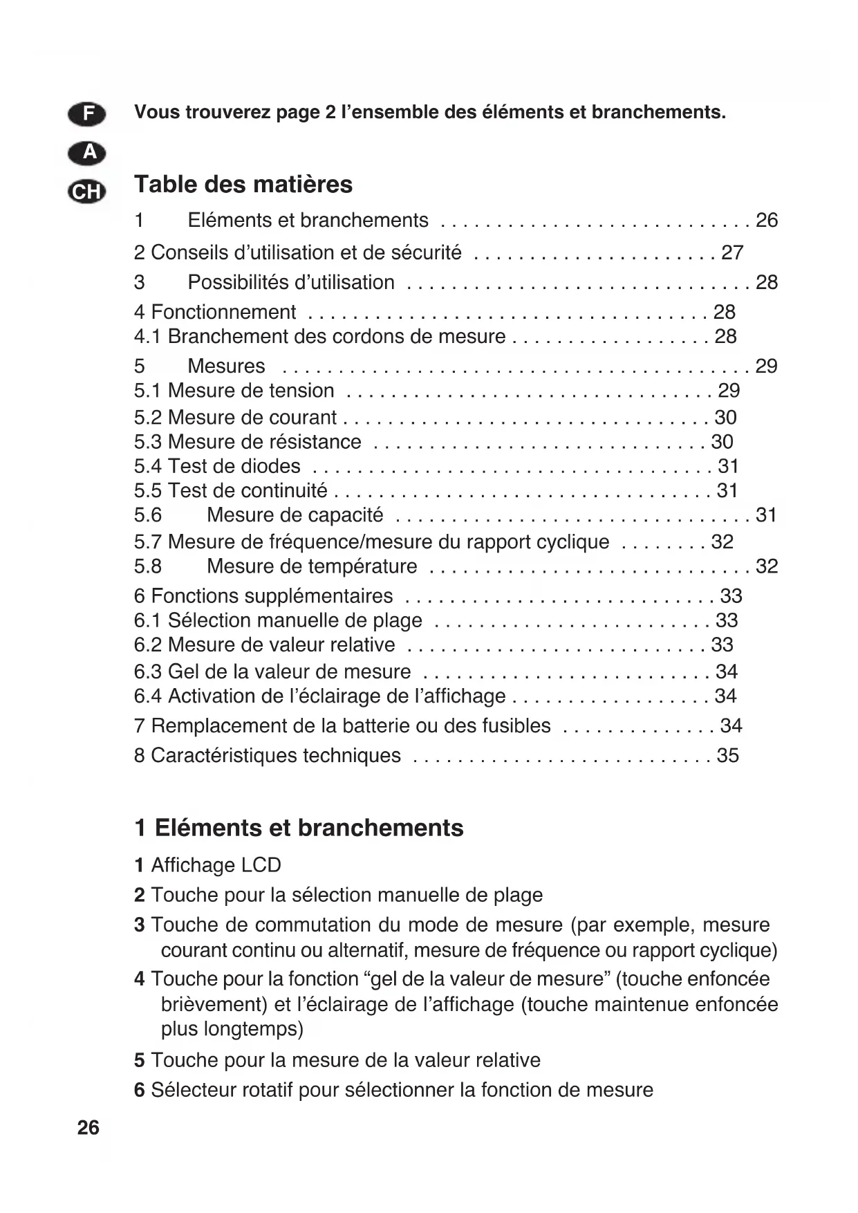 7 Remplacement de la batterie ou des fusibles . . . . . . . . . . . . . . 34 8 Caractéristiques techniques . . . . . . . . . . . . . . . . . . . . . . . . . . . 35 1 Eléments et branchements 1 Affichage LCD 2 Touche pour la sélection manuelle de plage 3 Touche de commutation du mode de mesure (par exemple, mesure courant continu ou alternatif, mesure de fréquence ou rapport cyclique) 4 Touche pour la fonction “gel de la valeur de mesure” (touche enfoncée brièvement) et lʼéclairage de lʼaffichage (touche maintenue enfoncée plus longtemps) 5 Touche pour la mesure de la valeur relative 6 Sélecteur rotatif pour sélectionner la fonction de mesure