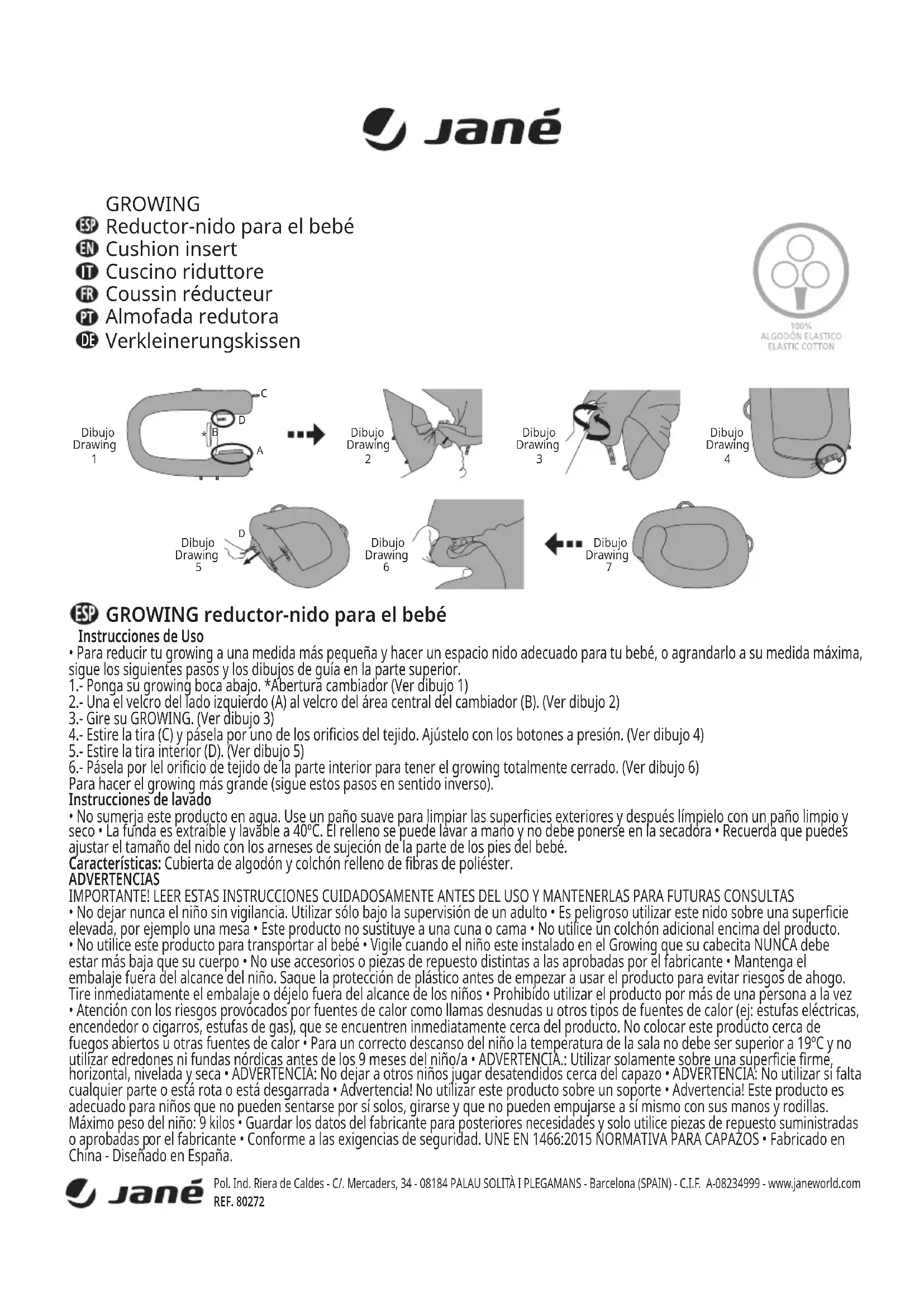 - Ne jamais laisser un enfant sans surveillance. Utiliser cet article uniquement sous la surveillance d’un adulte • Il est dangereux d’utiliser le coussin réducteur sur une surface en hauteur, comme une table • Cet article ne remplace ni le berceau ni le lit • Ne pas utiliser de matelas supplémentaire sur le produit • NE PAS utiliser ce produit pour transporter le bébé • Une fois l’enfant installé dans le growing, assurez-vous que la tête N’est JAMAIS plus basse que son corps • ll ne faut pas utiliser d’accessoires ou de pièces de rechange autres que celles recommandées par le fabricant • Tenir l’emballage hors de portée des enfants. Retirer la protection en plastique avant d’utiliser l’article afin d’éviter tout risque d’asphyxie. Jeter immédiatement l’emballage ou le tenir hors de portée des enfants • Il est interdit d’utiliser le coussin avec plus d’un enfant à la fois • Attention aux risques provoqués par des surfaces chaudes, des flammes ou autres sources de chaleur (radiateurs électriques, à gaz, briquets ou cigarettes) qui se trouvent à proximité de l’article. Ne pas placer ce produit près de feux ouverts ou autres sources de chaleur • Pour un bon repos de l’enfant, la température de la pièce ne doit pas être supérieure à 19ºC. Ne pas utiliser de couettes ni d’édredons avant 9 mois • AVERTISSEMENT : Utiliser uniquement sur une surface ferme, horizontale, à niveau et sèche • AVERTISSEMENT : Ne jamais laisser d’autres enfants jouer sans surveillance près du couffin • AVERTISSEMENT : Ne pas utiliser s’il manque une partie ou s’il est déchiré • Avertissement ! Ne pas utiliser ce produit sur un support • Avertissement ! Ce produit est adéquat pour des enfants qui ne peuvent pas s’asseoir seuls, se tourner ni se pousser seuls à l’aide des mains ou des genoux. Poids maximum de l’enfant : 9 kilos • Conserver les coordonnées du fabricant pour des besoins ultérieurs et utiliser seulement des pièces de rechange fournies ou approuvées par le fabricant • Conforme aux exigences de sécurité. UNE EN 1466:2015 RÈGLEMENTATION POUR COUFFINS • Fabriqué en Chine - Conçu en Espagne. Dibujo Drawing