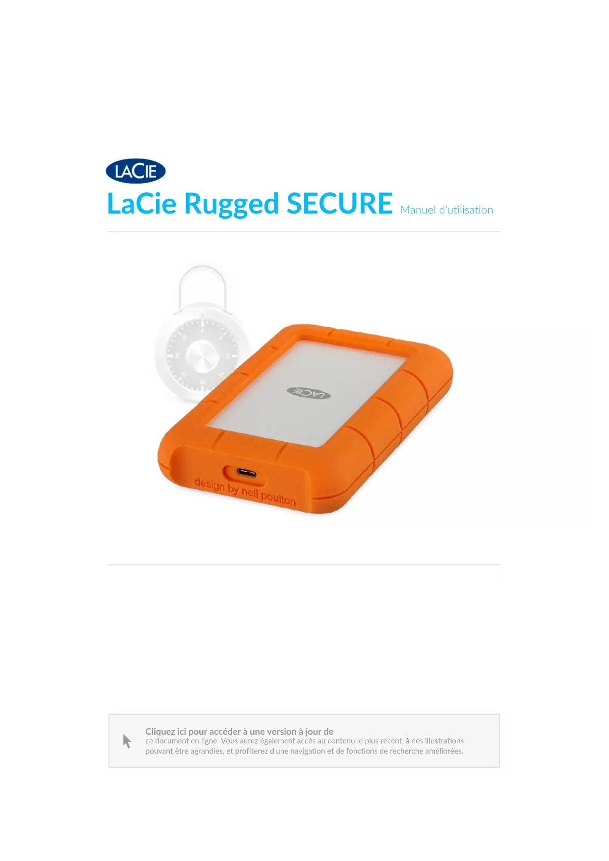 LaCie Rugged SECURE Manuel d'utilisation Cliquez ici pour accéder à une version à jour de ce document en ligne. Vous aurez également accès au contenu le plus récent, à des illustrationspouvant être agrandies, et profiterez d'une navigation et de fonctions de recherche améliorées.