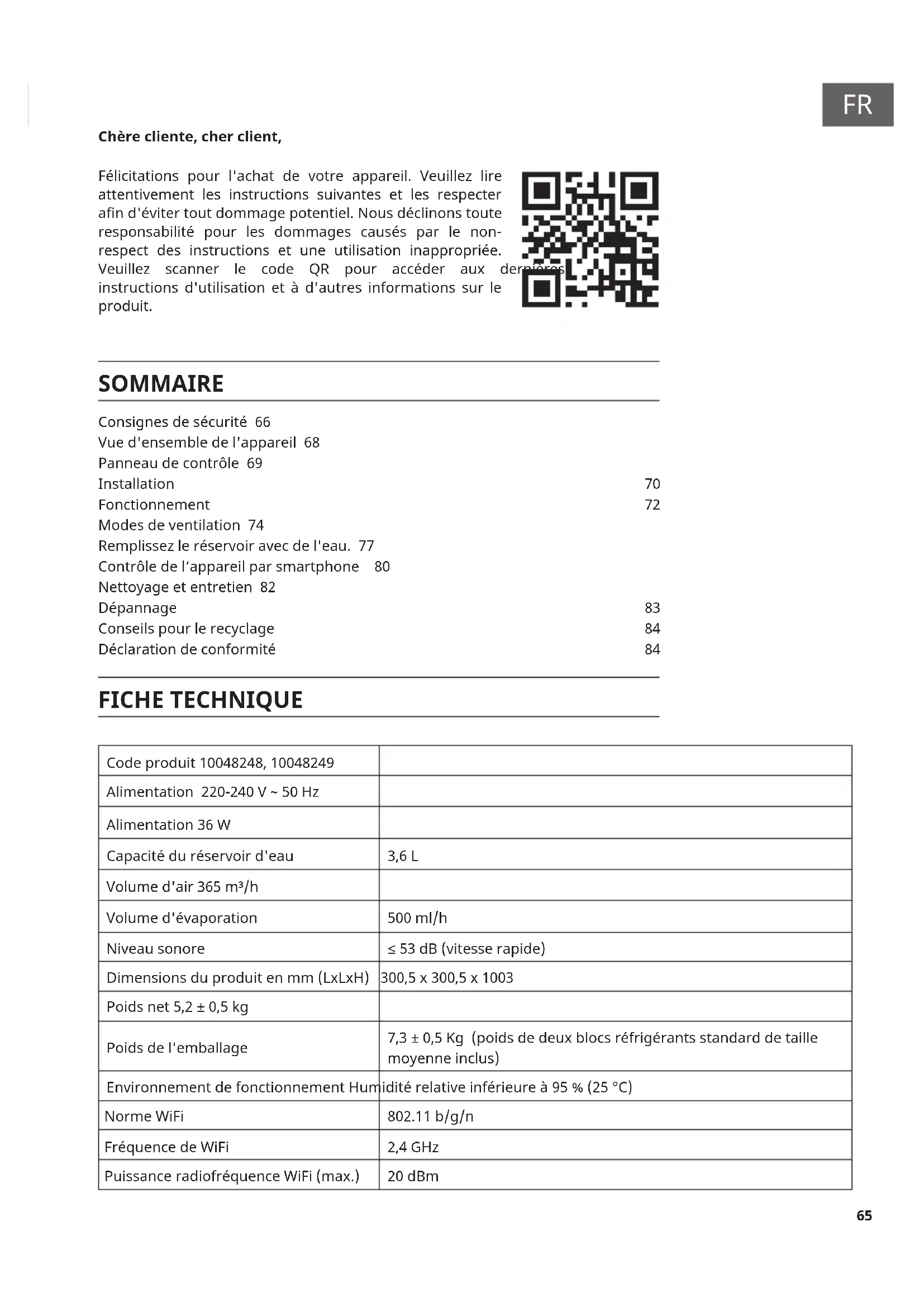 Chère cliente, cher client, Félicitations pour l'achat de votre appareil. Veuillez lire attentivement les instructions suivantes et les respecter and'évitertoutdommagepotentiel.Nousdéclinonstoute responsabilité pour les dommages causés par le non- respect des instructions et une utilisation inappropriée. Veuillez scanner le code QR pour accéder aux dernières instructions d'utilisation et à d'autres informations sur le produit. SOMMAIRE FICHE TECHNIQUE Code produit 10048248, 10048249 Alimentation 220-240 V ~ 50 Hz Alimentation 36 W Capacité du réservoir d'eau 3,6 L Volume d'air 365 m³/h Volume d'évaporation 500 ml/h Niveau sonore ≤53dB(vitesserapide) Dimensionsduproduitenmm(LxLxH) 300,5x300,5x1003 Poids net 5,2 ± 0,5 kg Poids de l'emballage 7,3±0,5Kg(poidsdedeuxblocsréfrigérantsstandarddetaille moyenneinclus) Environnement de fonctionnement Humiditérelativeinférieureà95%(25°C) Norme WiFi