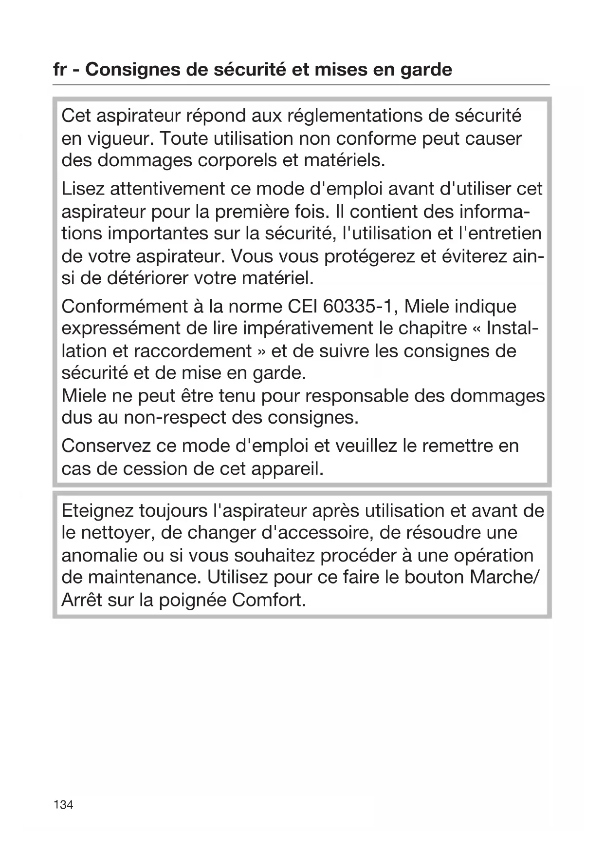Cet aspirateur répond aux réglementations de sécurité en vigueur. Toute utilisation non conforme peut causer des dommages corporels et matériels. Lisez attentivement ce mode d'emploi avant d'utiliser cet aspirateur pour la première fois. Il contient des informa- tions importantes sur la sécurité, l'utilisation et l'entretien de votre aspirateur. Vous vous protégerez et éviterez ain- si de détériorer votre matériel. Conformément à la norme CEI60335-1, Miele indique expressément de lire impérativement le chapitre «Instal- lation et raccordement» et de suivre les consignes de sécurité et de mise en garde. Miele ne peut être tenu pour responsable des dommages dus au non-respect des consignes. Conservez ce mode d'emploi et veuillez le remettre en cas de cession de cet appareil. Eteignez toujours l'aspirateur après utilisation et avant de le nettoyer, de changer d'accessoire, de résoudre une anomalie ou si vous souhaitez procéder à une opération de maintenance. Utilisez pour ce faire le bouton Marche/ Arrêt sur la poignéeComfort.fr - Consignes de sécurité et mises en garde
