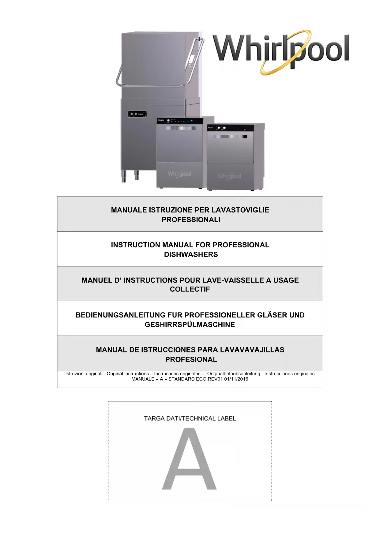 The drain pipe is not positioned correctly or is partially obstructed. Check if the pipe and the drain of the dishwasher are obstructed and if the drain is positioned too high up; refer to the connection diagram. Never us e the following types of products to clean the tank and the steel surfaces: - Products containing chlorides or hydrochloric acid - Bleach - Products for cleaning silver - Scouring pads or metal sponges NB: the incorrect use of the afore-mentioned products may cause rust marks on the surfaces.28 MANUEL D’ INSTRUCTIONS POUR LAVE-VAISSELLE A USAGE COLLECTIF Nous vous remercions pour avoir choisi notre produit. Veuillez lire attentivement toutes les instructions contenues dans le manuel pour connaitre les conditions les plus appropriées en vue d'une utilisation correcte du lave-vaisselle. INSTRUCTIONS TECHNIQUES : Elles sont destinées au personnel qualifié devant effectuer l'installation, la mise en service, l'essai et d'éventuelles interventions d'assistance. Le technicien installateur devra s'assurer que l'utilisateur soit informé du manuel contenant les instructions, qu'il ait compris le correct fonctionnement de la machine, qu'il sache remplir correctement les paniers consacrés à la vaisselle et aux verres.
