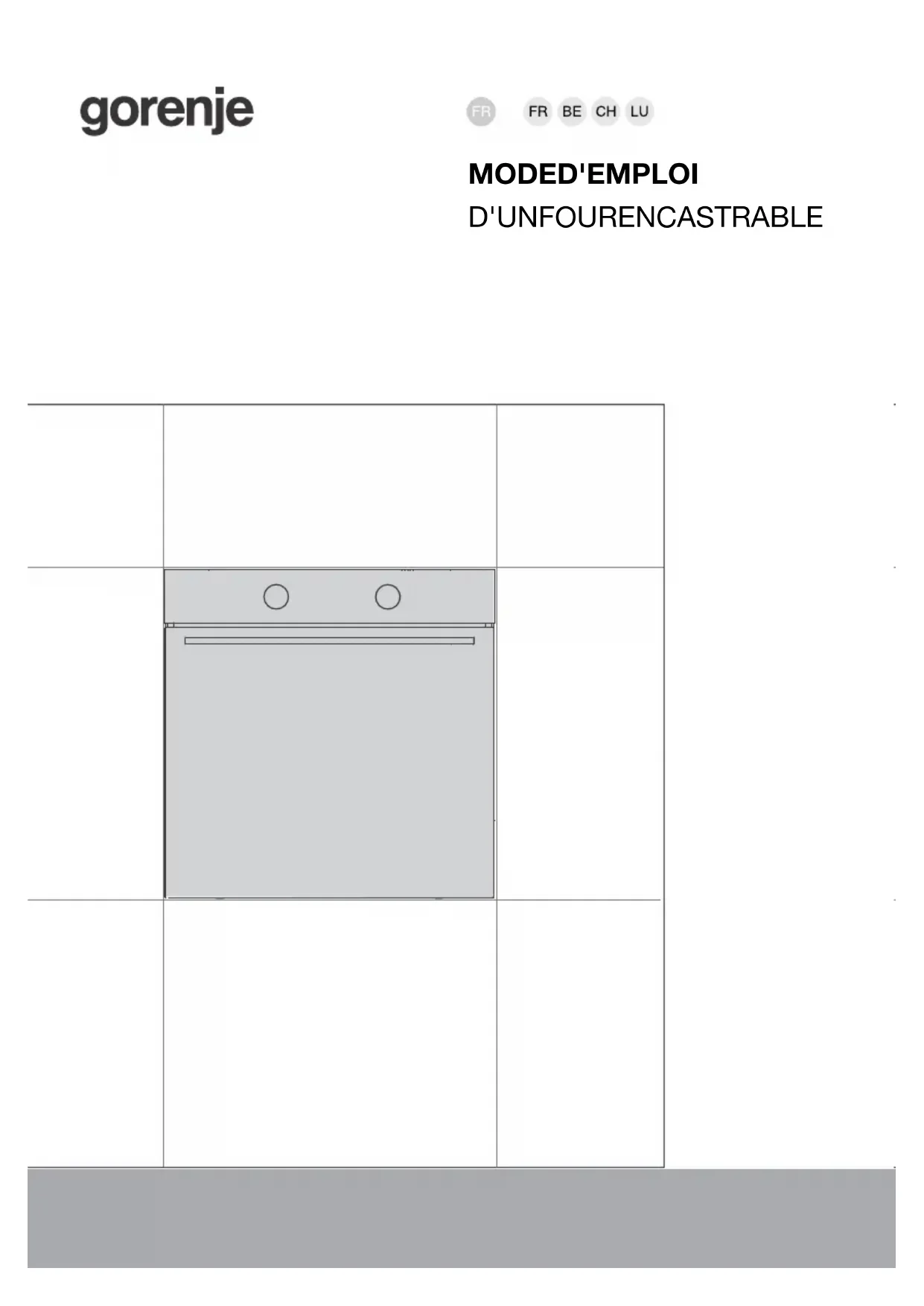 - MODE D'EMPLOI D'UN FOUR ENCASTRABLENous vous remercions de la confiance que vous nous avez manifestée en achetant un appareil de notre marque. Nous vous fournissons une notice détaillée qui vous facilitera l’utilisation de cet appareil et vous permettra de vous familiariser rapidement avec lui. Vérifiez d'abord que l'appareil n'a subi aucun dommage durant le transport. Si vous constatez une quelconque avarie, veuillez contacter immédiatement le détaillant chez qui vous l'avez acheté ou l'entrepôt régional dont il provient. Vous trouverez le numéro de téléphone sur la facture ou le bon de livraison. Les instructions pour l’installation et le raccordement sont fournies sur une feuille séparée. Les instructions pour l’utilisation, l’installation et le raccordement sont également disponibles sur notre site Web: http://www.gorenje.com Les pictogrammes figurant dans cette notice ont les significations suivantes : INFORMATION Informations, conseils, astuces, ou recommandations ATTENTION ! Attention – danger Nous vous recommandons vivement de lire attentivement cette notice.Tables des matières 4Consignes de sécurité p. 6