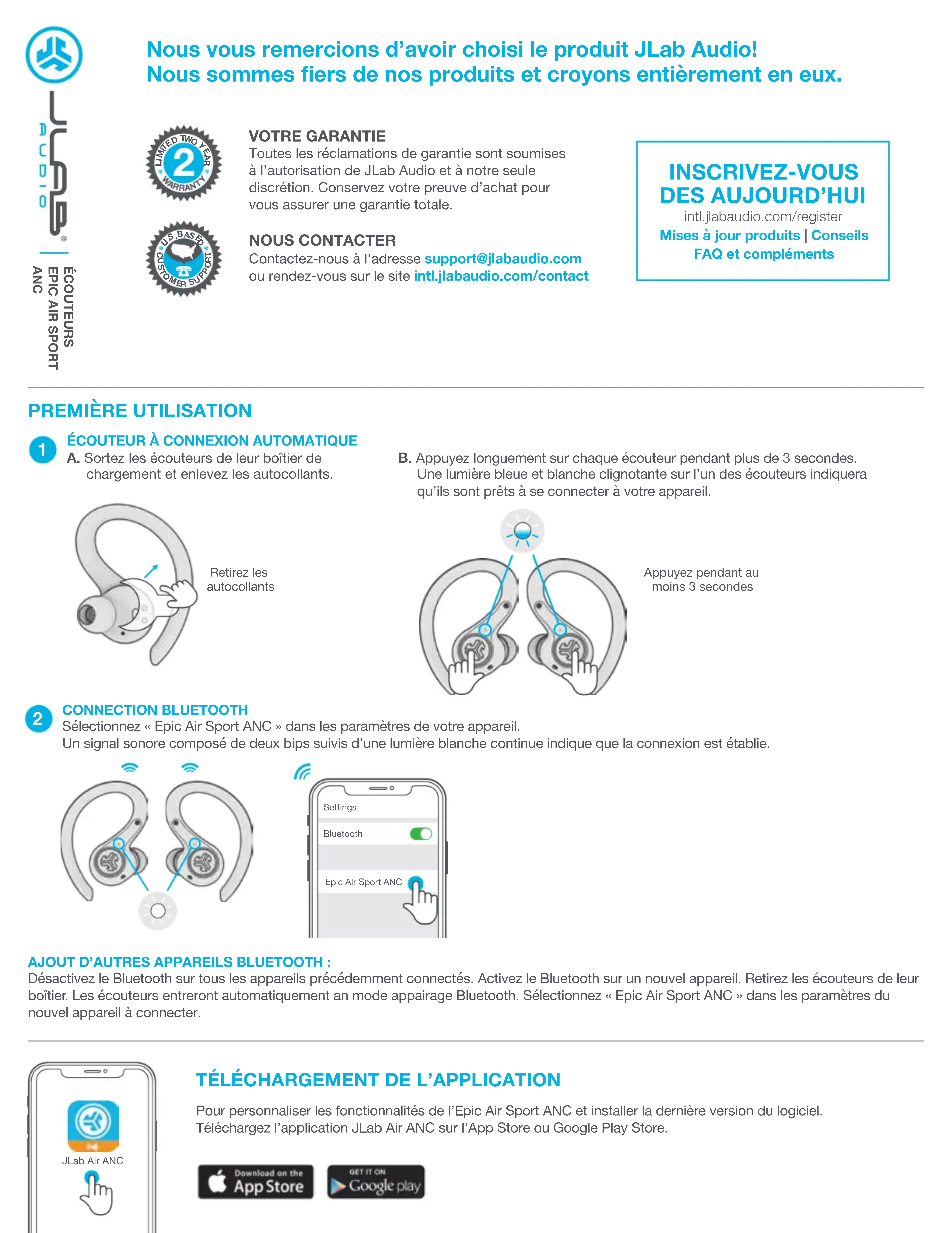 Pour personnaliser les fonctionnalités de l’Epic Air Sport ANC et installer la dernière version du logiciel. Téléchargez l’application JLab Air ANC sur l’App Store ou Google Play Store. JLab Air ANC B. Appuyez longuement sur chaque écouteur pendant plus de 3 secondes. Une lumière bleue et blanche clignotante sur l’un des écouteurs indiquera qu’ils sont prêts à se connecter à votre appareil.CONTRÔLES CAPTEUR TACTILE DROIT CAPTEUR TACTILE GAUCHE CHARGEMENT ÉCOUTEUR GAUCHE CHARGEMENT ÉCOUTEUR DROIT Bluetooth Settings JLab Epic Air Sport Connected MESSAGES SONORES MISE EN ROUTE: Carillon APPAIRAGE BLUETOOTH: « Ready to Pair ». Epic Air Sport ANC est prêt à s’apparier à votre appareil Bluetooth. BE AWARE ON/OFF: 1 bip / 2 bips ANC ON/OFF: Carillon BLUETOOTH CONNECTE: 2 bips. L’écouteur est connecté à l’appareil. BATTERIE PLEINE: « Battery Full » (de 100 à 80 %) BATTERIE MOYENNE: « Battery Medium » (de 80 à 20 %) BATTERIE FAIBLE: « Battery Low » (moins de 20 %. Lorsque la puissance passe en dessous de 10 %, le message « Low Battery » sera diffusé une fois) EXTINCTION: Carillon Lorsque vous placez les écouteurs dans leur boîtier de chargement, ils s’éteignent et commencent à se recharger. Le voyant bleu indique que les écouteurs sont en train de se recharger. Ce voyant s’éteint lorsque les écouteurs sont pleinement chargés. Lorsque vous sortez les écouteurs de leur boîtier de chargement, il s’allument et se connectent automatiquement. Appuyez trois fois sur l’un des écouteurs pour faire défiler les modes d’égaliseur (EQ). Un message sonore indique le mode EQ sélectionné (le cycle de l’Epic Air Sport ANC contient 4 modes d’égaliseur). Vous pouvez personnaliser tous les modes EQ en téléchargeant l’application JLab Air ANC sur l’App Store ou Google Play Store. MODES ÉGALISEUR BIP Paramètre d'égalisation personnalisé (téléchargez l'application JLab Air ANC pour personnaliser)