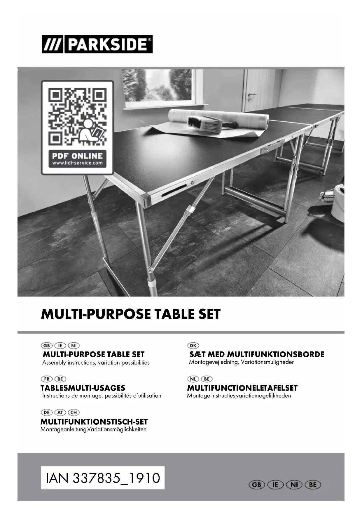 Rengøring og pleje Anvend ved kraftigere snavs en fugtig klud og i givet fald et mildt rengøringsmiddel. Bortskaffelse Indpakningen består af miljøvenlige materialer, som De kan bortskaffe over de lokale genbrugs- steder. De får oplyst muligheder til bortskaffelse af det udtjente produkt hos deres lokale myndigheder eller bystyre. Service Service Danmark Tel.: 32 710005 E-Mail: owim@lidl.dk9 FR/BE Tables multi-usages Introduction Nous vous félicitons pour l‘achat de votre nou- veau produit. Vous avez opté pour un produit de grande qualité. Avant la première mise en service, vous devez vous familiariser avec toutes les fonctions du produit. Veuillez lire attentivement le mode d’emploi ci-dessous et les consignes de sécurité. N’utilisez le produit que pour l’usage décrit et les domaines d’application cités. Conser- ver ces instructions dans un lieu sûr. Si vous don- nez le produit à des tiers, remettez-leur également la totalité des documents. Utilisation conforme Cet ensemble de tables multifonction dispose de trois éléments de table, qui peuvent s’utiliser individuellement ou ensemble. De plus, vous avez le choix entre quatre hauteurs de table différentes. Les tables multifonction sont utilisables de nom- breuses manières, par ex. comme table à tapisser, lors de fêtes et bien plus encore. Ces tables sont simples à transporter et prennent peu de place une fois repliées. Ce produit est uniquement conçu pour un usage domestique privé et non pas pour un usage commercial. Descriptif des pièces Immédiatement après le déballage du produit, veuillez toujours contrôler que le contenu de la livraison est complet et que le produit est en parfait état.