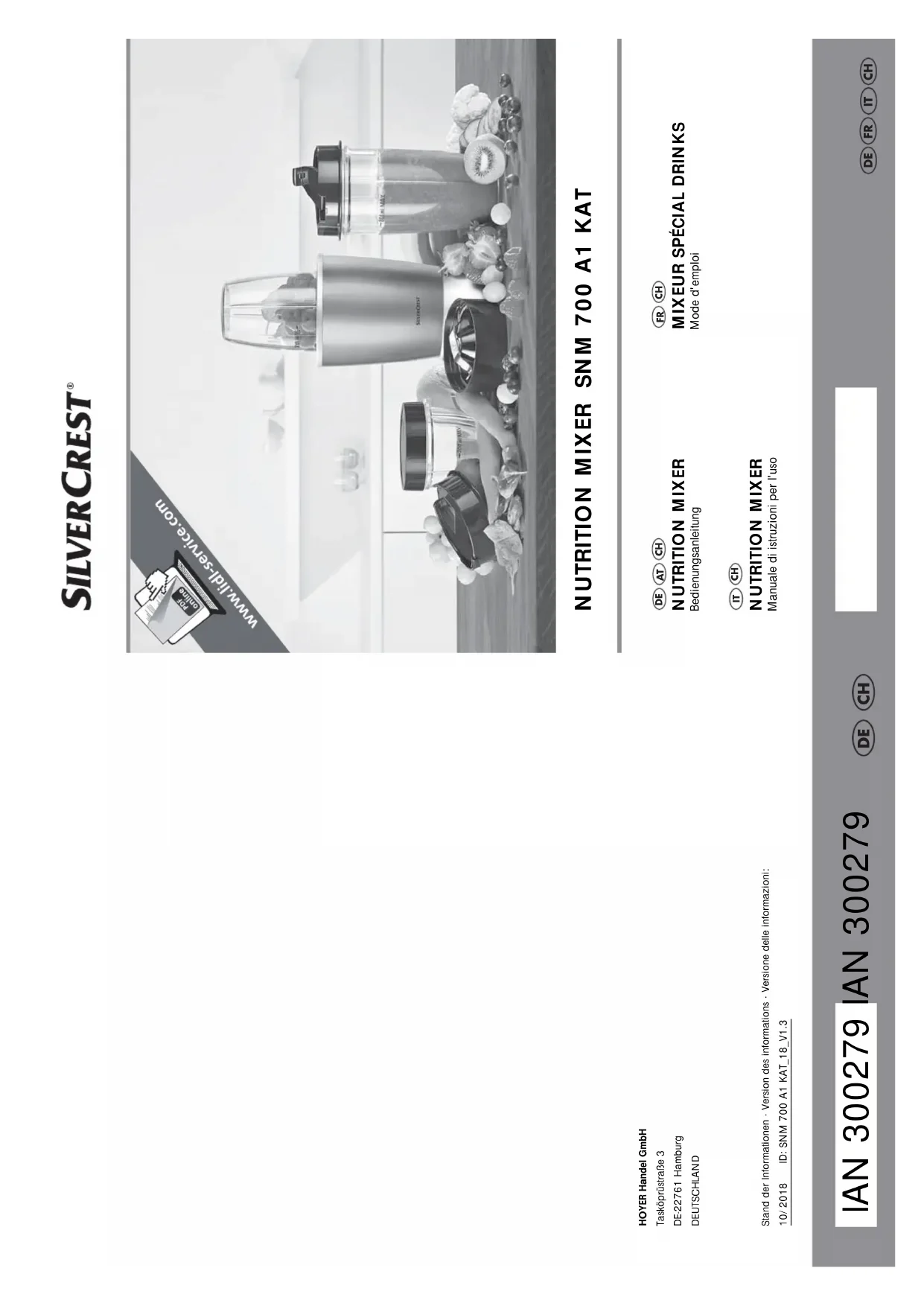 HOYER Handel GmbH Chère cliente, cher client, Vous obtenez pour cet appareil une garantie de 3 ans à compter de la date d’achat. En cas de défauts de ce produit, vous disposez de droits légaux contre le vendeur de ce pro- duit. Ces droits ne sont pas limités par notre garantie présentée par la suite. Indépendamment de la garantie commer- ciale souscrite, le vendeur reste tenu des dé- fauts de conformité du bien et des vices rédhibitoires dans les conditions prévues aux articles L217-4 à L217-13 du Code de la consommation et aux articles 1641 à 1648 et 2232 du Code Civil. Article L217-16 du Code de la consommation Lorsque l‘acheteur demande au vendeur, pendant le cours de la garantie commer- ciale qui lui a été consentie lors de l‘acquisi- tion ou de la réparation d‘un bien meuble, une remise en état couverte par la garantie, toute période d‘immobilisation d‘au moins sept jours vient s‘ajouter à la durée de la ga- rantie qui restait à courir. Cette période court à compter de la demande d‘interven- tion de l‘acheteur ou de la mise à disposition pour réparation du bien en cause, si cette mise à disposition est postérieure à la de- mande d‘intervention. Article L217-4 du Code de la consommation Le vendeur livre un bien conforme au contrat et répond des défauts de conformité existant lors de la délivrance. Il répond également des défauts de confor- mité résultant de l‘emballage, des instruc- tions de montage ou de l‘installation lorsque celle-ci a été mise à sa charge par le contrat ou a été réalisée sous sa responsabilité. Modèle : SNM 700 A1 KAT Tension secteur : 220–240 V ~ 50/60 Hz Classe de protection : I Puissance : 700 W Max. Fonctionnement continu (KB) : 1 minute Quantité de remplis- sage : 150 ml - 800 ml Geprüfte Sicherheit (sécurité contrôlée). Les appareils doivent satisfaire aux Règles techniques reconnues en vigueur et être conformes à la Loi sur la sécurité des produits (Produktsicherheits- gesetz/ ProdSG). Avec ce marquage CE, la société HOYER Handel GmbH déclare la conformité avec la règlementa- tion de l'Union européenne. Ce symbole rappelle qu'il faut éli- miner l'emballage en respectant l'environnement. Matériaux recyclables : carton (hormis le carton ondulé)24