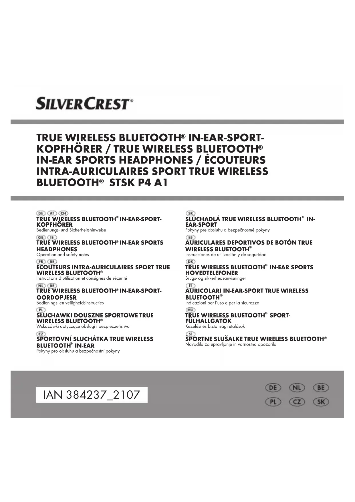 IN- EAR SPORTS HEADPHONES, HG07157, is in compliance with Directive 2014/53/EU and 2011/65/EU. The full text of the EU declaration of conformity is available at the following internet address: www.owim.com72 GB/IE Warranty The product has been manufactured to strict quality guidelines and meticulously examined before delivery. In the event of product defects you have legal rights against the retailer of this product. Your legal rights are not limited in any way by our warranty detailed below. The warranty for this product is 3 years from the date of purchase. The warranty period begins on the date of purchase. Please keep the original sales receipt in a safe location. This document is required as your proof of purchase. Should this product show any fault in materials or manufacture within 3 years from the date of purchase, we will repair or replace it – at our choice – free of charge to you. This warranty becomes void if the product has been damaged, or used or maintained improperly. The warranty applies to defects in material or manufacture. This warranty does not cover product parts subject to normal wear, thus possibly considered consumables (e.g. batteries) or for damage to fragile parts, e.g. switches, rechargeable batteries or glass parts.73GB/IE Warranty claim procedure To ensure quick processing of your case, please observe the following instructions: Please have the till receipt and the item number (IAN 384237_2107) available as proof of purchase. You will find the item number on the rating plate, an engraving, on the front page of the instructions for use (bottom left), or as a sticker on the rear or bottom of the product. If functional or other defects occur, please contact the service department listed either by telephone or by e-mail. You can return a defective product to us free of charge to the service address that will be provided to you. Ensure that you enclose the proof of purchase (till receipt) and information about what the defect is and when it occurred.74 GB/IE Service Service Great Britain Tel.: 08000569216 E-Mail: owim@lidl.co.uk Service Ireland Tel.: 1800 200736 E-Mail: owim@lidl.ie75FR/BE Avertissements et symboles utilisés ................ Page 77 Introduction ....................................... Page 80 Utilisation conforme aux prescriptions ............. Page 80 Indications de marque ............................. Page 81 Contenu de l'emballage............................ Page 82 Vous avez besoin .................................. Page 82 Description des pièces ............................. Page 83 Données techniques ............................... Page 84 Consignes de sécurité .............................. Page 86 Consignes de sécurité concernant les accus intégrés....... Page 91 Avant la première utilisation ....................... Page 91 Recharger l'accu grâce à la boîte de recharge/rangement.. Page 92 Recharge des écouteurs............................. Page 93 Fonctionnement ................................... Page 94 Boîte de recharge/rangement . . . . . . . . . . . . . . . . . . . . . . . . Page 9476 FR/BE Écouteurs.......................................... Page 95 Allumer les écouteurs ............................... Page 95 Éteindre les écouteurs............................... Page 95 Éteindre les écouteurs manuellement ................... Page 95 État des LED ...................................... Page 96 Coupler les écouteurs ensemble ...................... Page 96 Couplage des écouteurs à un appareil Bluetooth ......... Page 97 Réinitialiser ....................................... Page 98 Fonctions des touches des écouteurs pour la lecture de musique............................... Page 98 Casque pour appels/commande de la lecture ........... Page 100 Fonction de commande vocale avec Siri/Google Assistant . Page 101 Nettoyage et entretien............................. Page 102 Rangement en cas de non-utilisation ................... Page 103 Dépannage........................................ Page 103 Mise au rebut...................................... Page 105 Déclaration de conformité CE simplifiée............. Page 106 Garantie .......................................... Page 107 Faire valoir sa garantie ............................. Page 110 Service après-vente................................ Page 11177FR/BE Avertissements et symboles utilisés Les avertissements suivants sont utilisés dans ce mode d'emploi, sur l'emballage et sur le produit: DANGER! Ce symbole avec ce signal important de «Danger» indique un danger avec un risque élevé de blessures graves ou de mort si la situation dangereuse n’est pas évitée. AVERTISSEMENT! Ce symbole avec ce signal important d'«Avertissement» indique un danger avec un risque moyen de blessures graves ou de mort si la situation dangereuse n'est pas évitée. PRUDENCE! Ce symbole avec ce signal important de «Prudence» indique un danger avec un risque faible de blessures légères à importantes si la situation dangereuse n'est pas évitée.78 FR/BE ATTENTION! Ce symbole avec la mention «Attention» indique un possible risque de dégâts matériels. REMARQUE: Ce symbole avec ce signal important de «Remarque» propose plus d'informations utiles. AVERTISSEMENT! RISQUE D'EXPLOSION! Un avertissement qui présente ce signe et les mots «AVERTISSEMENT! RISQUE D'EXPLOSION!» signale un possible risque d'explosion. Si un tel avertissement n'est pas suivi, cela peut entraîner des blessures graves ou causer un danger mortel et provoquer des dégâts matériels. Suivez les instructions de cet avertissement afin soit d’éviter des blessures graves ou mortelles soit de prévenir le risque de dégâts matériels!79FR/BE Ce signe d'obligation indique que le port de gants protecteurs est nécessaire! Suivez cet avertissement, pour éviter des blessures aux mains qui pourraient être provoquées par des objets ou le contact avec des matériaux chauds ou chimiques! Un avertisse