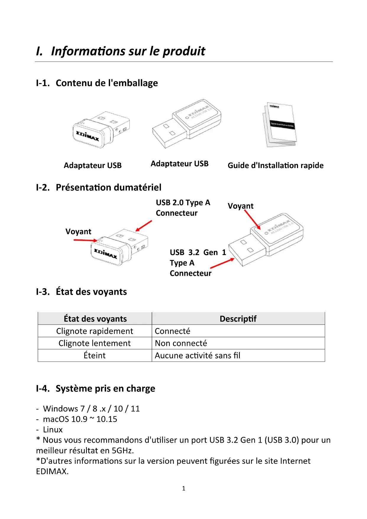 - Nous vous recommandons d'utiliser un port USB 3.2 Gen 1 (USB 3.0) pour un meilleur résultat en 5GHz. *D'autres informations sur la version peuvent figurées sur le site Internet EDIMAX. État des voyants Descriptif Clignote rapidement Connecté Clignote lentement Non connecté Éteint Aucune activité sans fil USB 2.0 Type A Connecteur Adaptateur USB Adaptateur USB Guide d'Installation rapide Voyant Voyant USB 3.2 Gen 1 Type A Connecteur2 Insérer Plug-and-Play Connexion