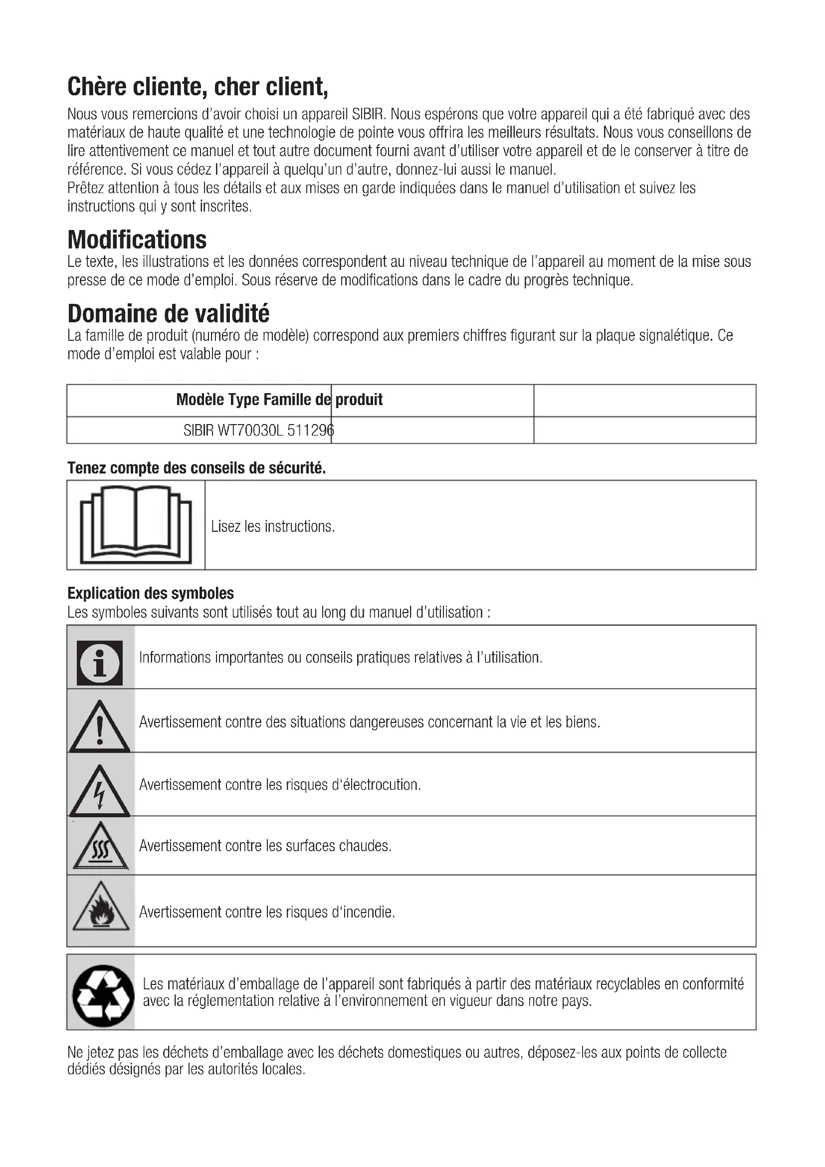 136Chère cliente, cher client, Nous vous remercions d’avoir choisi un appareil SIBIR. Nous espérons que votre appareil qui a été fabriqué avec des matériaux de haute qualité et une technologie de pointe vous offrira les meilleurs résultats. Nous vous conseillons de lire attentivement ce manuel et tout autre document fourni avant d’utiliser votre appareil et de le conserver à titre de référence. Si vous cédez l’appareil à quelqu’un d’autre, donnez-lui aussi le manuel. Prêtez attention à tous les détails et aux mises en garde indiquées dans le manuel d’utilisation et suivez les instructions qui y sont inscrites. Modifications Le texte, les illustrations et les données correspondent au niveau technique de l’appareil au moment de la mise sous presse de ce mode d’emploi. Sous réserve de modifications dans le cadre du progrès technique. Domaine de validité La famille de produit (numéro de modèle) correspond aux premiers chiffres figurant sur la plaque signalétique. Ce mode d’emploi est valable pour : Modèle Type Famille de produit