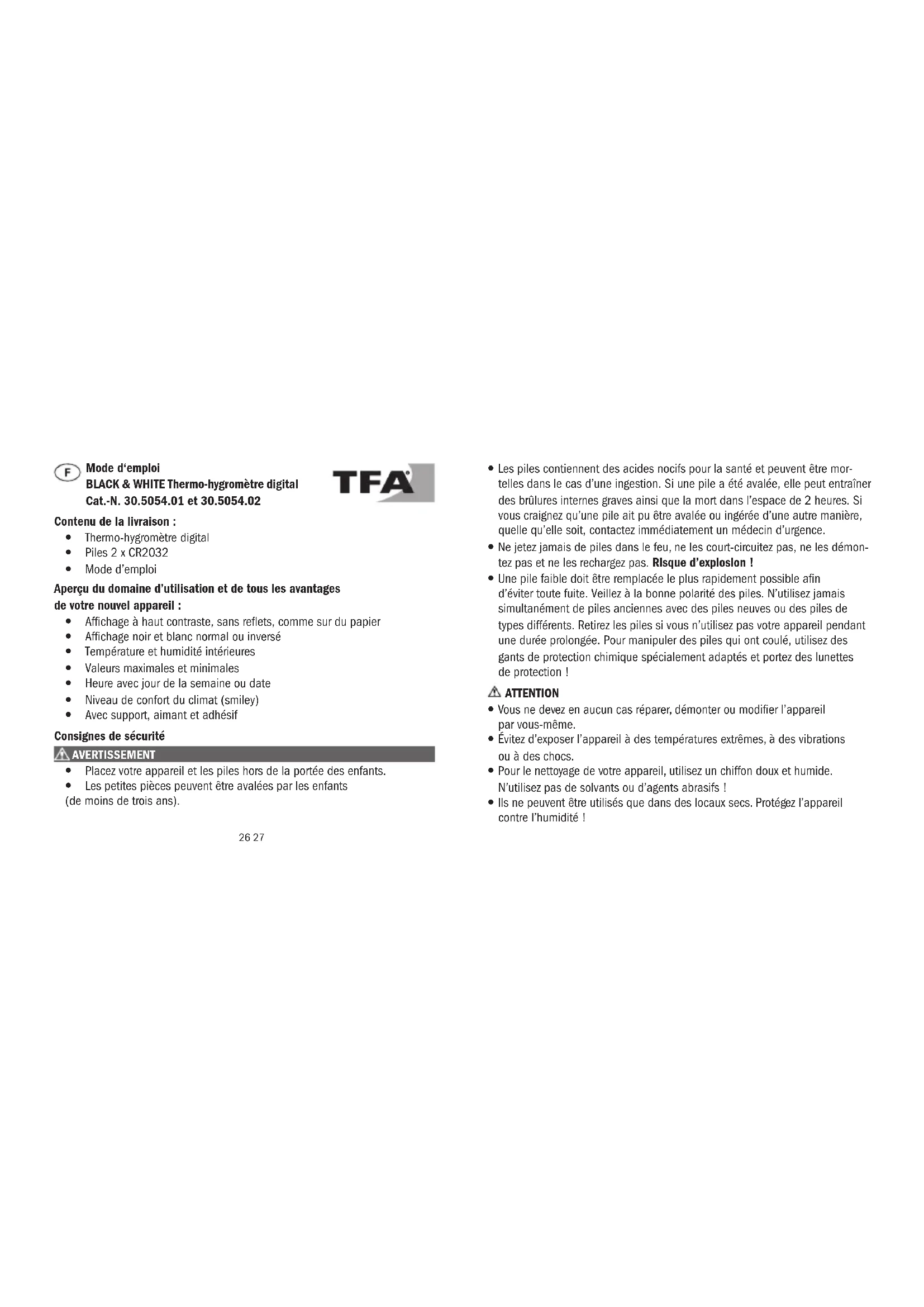 MODE D'EMPLOI Black & White 30.5054.01 TFA