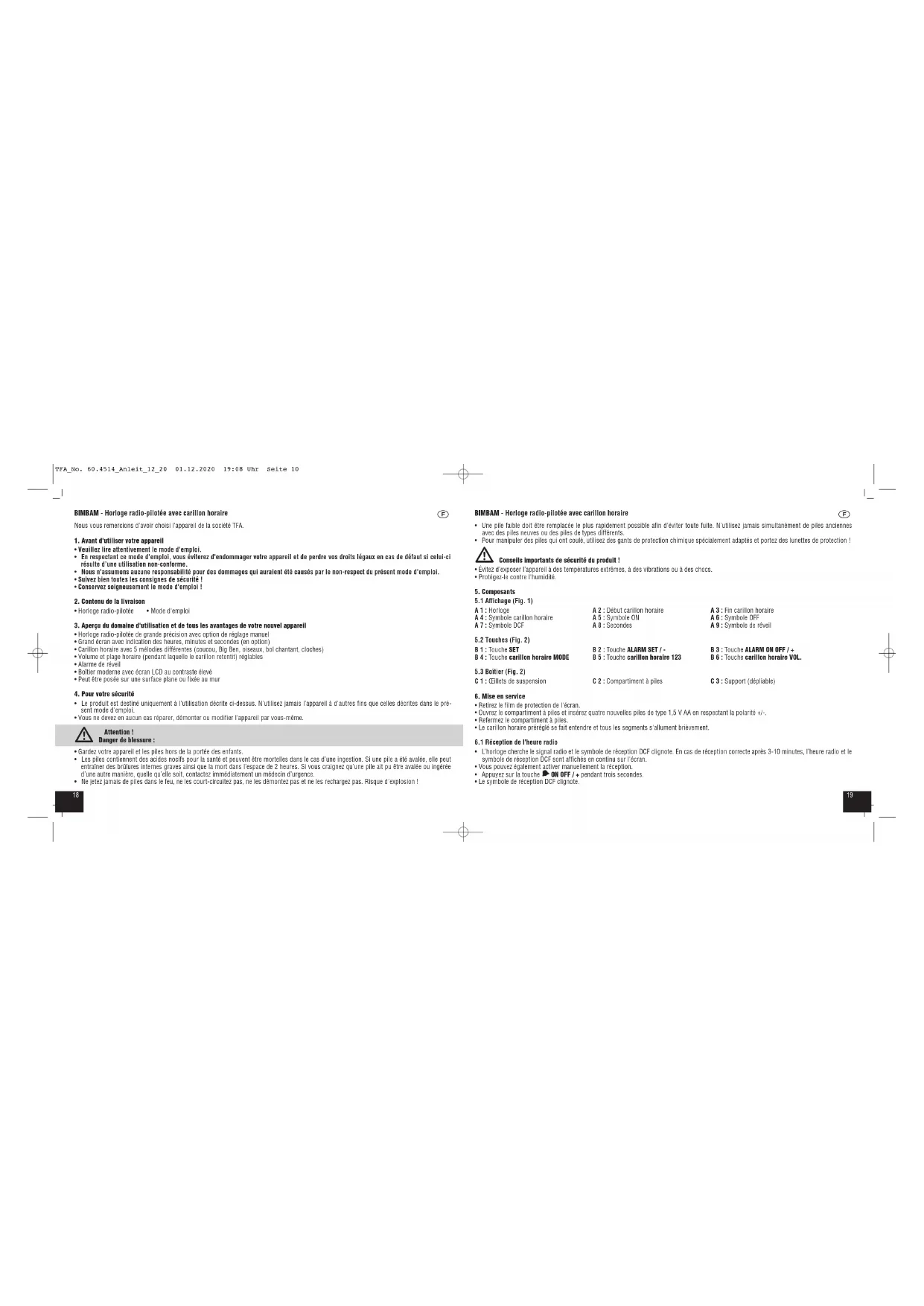 - Ne jetez jamais de piles dans le feu, ne les court-circuitez pas, ne les démontez pas et ne les rechargez pas. Risque d'explosion ! TFA_No. 60.4514_Anleit_12_20 01.12.2020 19:08 Uhr Seite 10BIMBAM - Horloge radio-pilotée avec carillon horaire