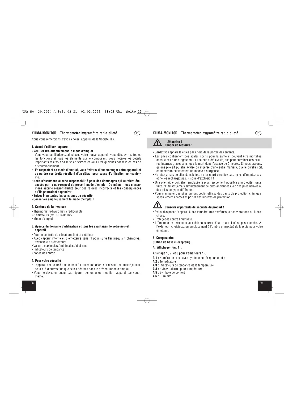 - Vous ne devez en aucun cas réparer, démonter ou modifier l'appareil par vous- même. TFA_No. 30.3054_Anleit_03_21 02.03.2021 18:02 Uhr Seite 153130 KLIMA-MONITOR – Thermomètre-hygromètre radio-piloté